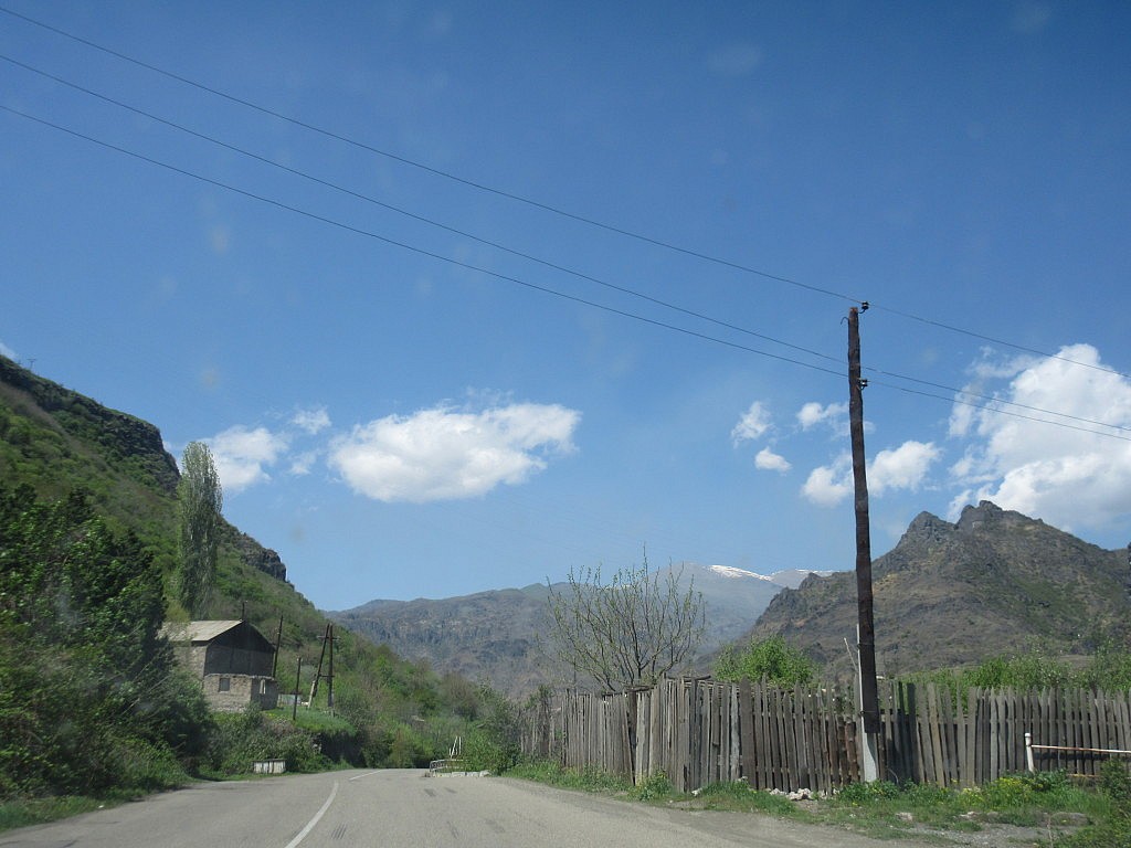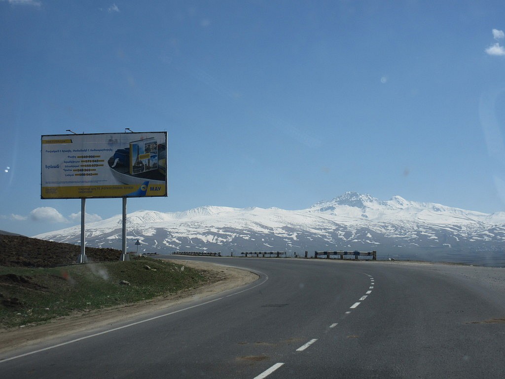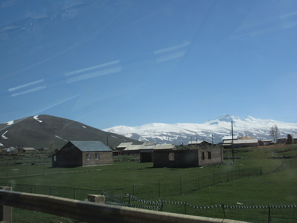 Freitagmorgen hab ich dann den zweiten Versuch gestartet. Ich hatte sogar noch einen Begleiter gefunden. Wir sind um 9 Uhr am Bahnhof gewesen und wollten eigentlich die erste Marshrutka nehmen, doch die führen nur im Sommer, wurde uns gesagt. Der Fahrer bot aber an – wenn noch ein paar Menschen mit wollten – schon um 10 statt wie laut Plan erst um 11 Uhr zu fahren. Also haben wir noch was gefrühstückt und sind dann um 10 Uhr mit der Marshrutka los. 30 Lari, das sind etwa 13 Euro, kostet die fünfeinhalb stündige Fahrt bis nach Yerevan. Bis zur Grenze kamen wir ohne Probleme. Es war gutes Wetter und so hatten wir eine unglaubliche Sicht auf die Landschaft, insbesondere die Berge des Kleinen Kaukasus‘.