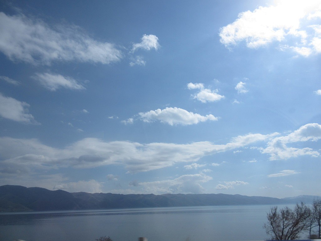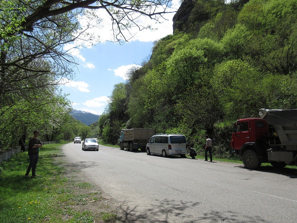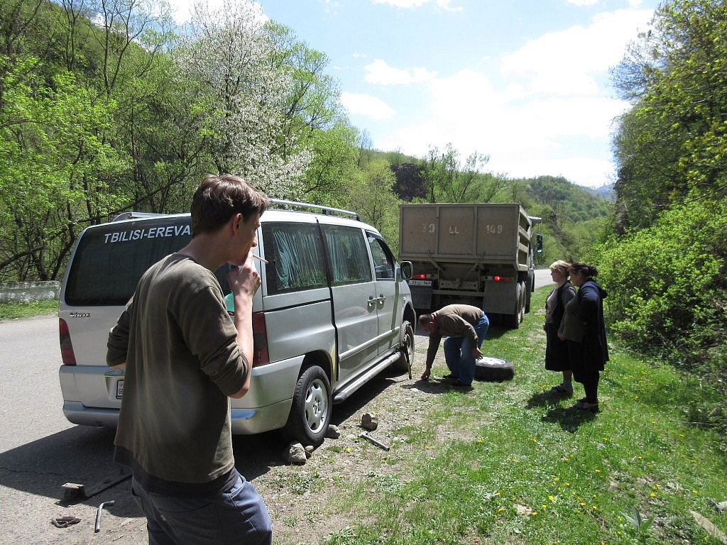 An der Grenze mussten wir aussteigen, haben den ersten Stempel in unsere Pässe bekommen, „raus aus Georgien“, sind dann mit dem Auto ein Stückchen weiter bis zur armenischen Grenze gefahren, wo wir uns in eine Schlange stellen und kurz warten mussten. Dann haben wir den zweiten Stempel, „rein nach Armenien“ bekommen und durften passieren. Alles ohne Probleme und ohne lange Wartezeiten. Die Landschaft hinter der Grenze sah noch aus wie Georgien. Die Dörfer sahen den georgischen ebenfalls sehr ähnlich, kamen uns aber noch etwas ärmer vor, viele waren verlassen. Dann wurde es kärger. Wir kamen in höher gelegene Regionen. Armenien liegt durchschnittlich, glaube ich, auf 1800m! Man sah, dass fast überall bis vor Kurzem Schnee gelegen hatte, weshalb das Gras noch keine Chance hatte, grün zu werden. Rechts und links der kleinen zweispurigen Straße erhoben sich die braun-grauen Berge mit weißen Mützen. Irgendwo dort im Nirgendwo knallte es plötzlich super laut und unser Auto schlingerte kurz. Der Fahrer fuhr an den Rand und ging zielstrebig zum rechten vorderen Reifen. Der war nämlich geplatzt! Erst meinte er, mit dem zerfetzten Reifen voll auf der Felge seines Autos mit 15km/h weiter fahren zu müssen, aber dann hat er wohl auch realisiert, dass das nicht gerade die allerbeste Idee war und hat am Rand gehalten. An der Tankstelle war er allerdings vorbei gefahren. Dort, wo wir dann hielten, war nichts. Nur Natur. Er hat den Wagen aufgebockt (hatte nen Wagenheber dabei) und das kaputte Rad abmontiert. Dann fiel ihm auf, dass es schlauer gewesen wär, erstmal das Ersatzrad zu suchen und bereit zu legen… Das nämlich war nicht im Kofferraum wie erwartet sondern unterm Auto angebracht. Die Schraube war super verrostet und mit unserem Werkzeug war da nichts zu machen. Nach und nach hielten verschiedenste Fahrzeuge bei uns. Zwei LKWs packten ihr gesamtes Werkzeug aus und damit ließ sich die Schraube dann doch noch mühsam lockern. Zwischenzeitlich waren fünf Männer an unserem Auto am Werkeln (ich als Frau durfte nicht helfen). Doch als die Schraube gelöst war, ließ sich das Ersatzrad nicht herausziehen, weil das Auto dummerweise zu tief lag…! Schließlich fehlte ein Rad… Irgendwann hatten sie es schließlich doch geschafft und das Ersatzrad hervor geholt und erfolgreich anmontiert. So konnten wir nach einer Stunde Verzögerung doch weiter fahren.
