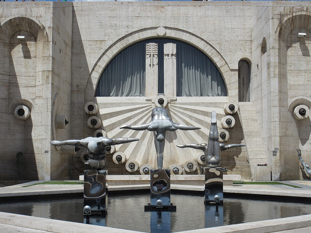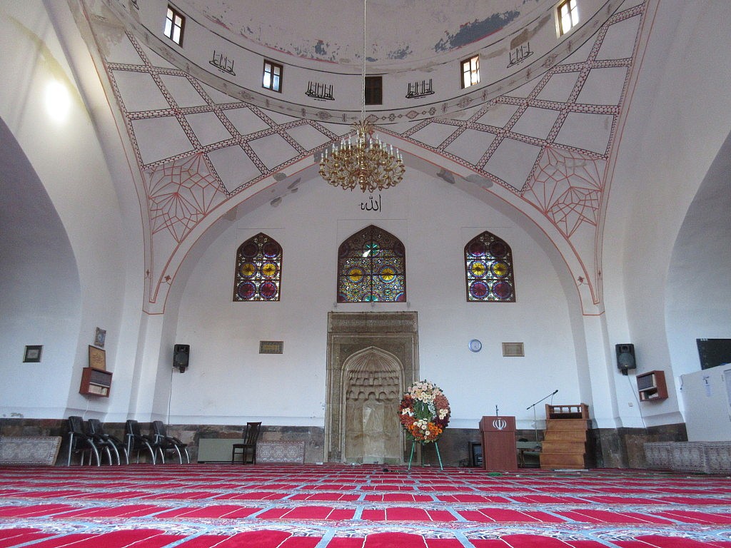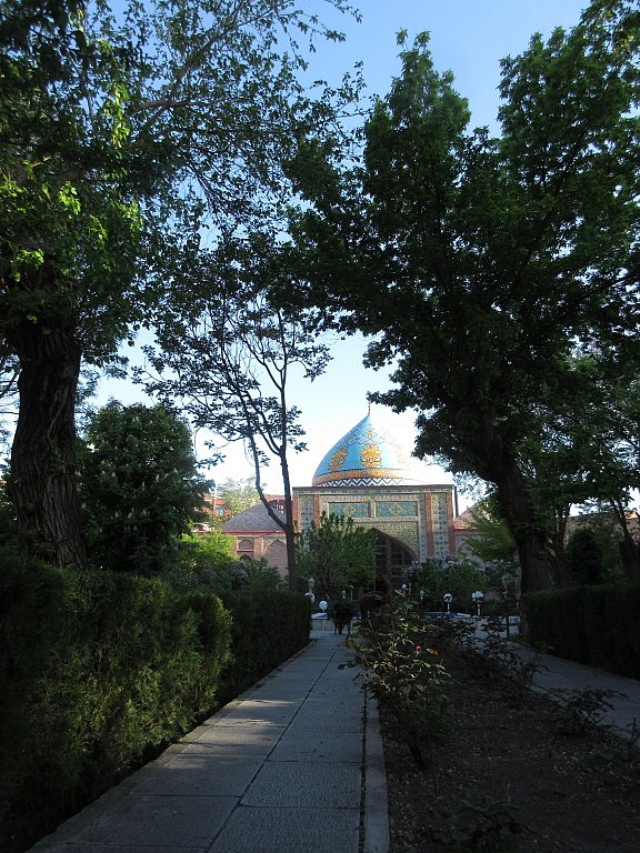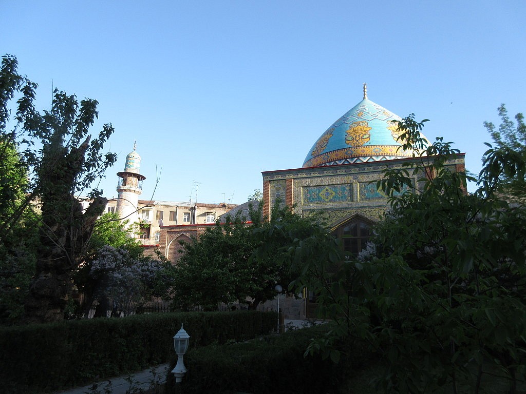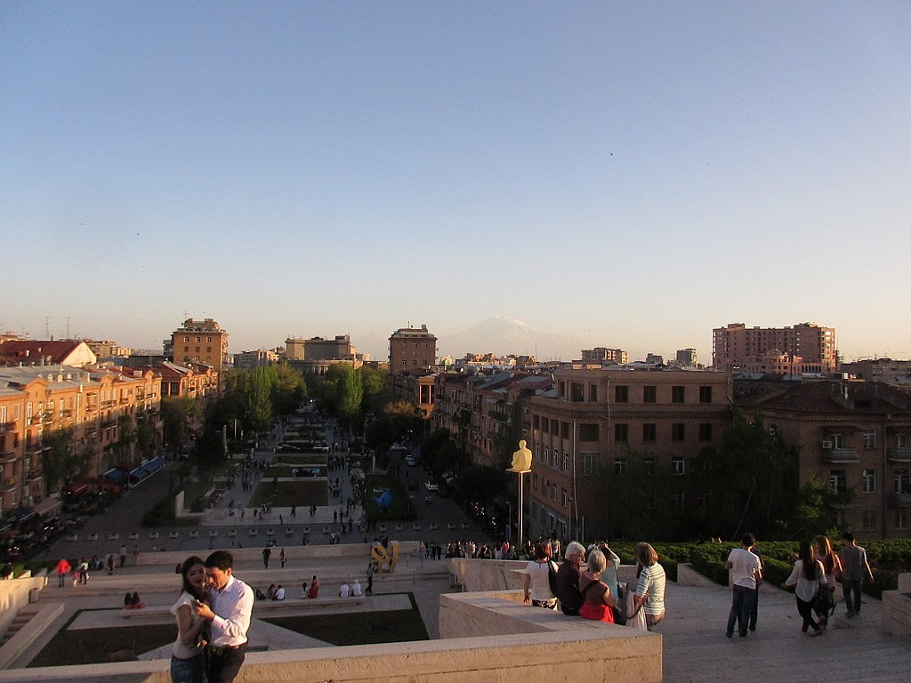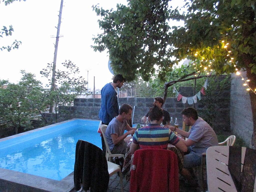 Am späten Nachmittag wurden wir dann jedenfalls in Yerevan rausgelassen. zuallererst haben wir uns um Geld gekümmert. Ich habe meine 100$ in armenische Dram gewechselt und habe dafür 47.040 Dram zurückbekommen!!! Was eine Währung! Ohne Stadtplan, eigentlich überhaupt ohne jeglichen Plan :D sind wir also durch die Stadt gelaufen und haben uns in ein nettes Café am Republic Square gesetzt und die immer noch knallende Abendsonne genossen. Von dort konnten wir dann auch mithilfe des Café-Wifis unseren Standort herausfinden und Kontakt zu Leonie aufnehmen, der kulturweit-Armenien-Freiwilligen, die angeboten hatte, uns für die Tage aufzunehmen. Bevor wir zu Leonie sind, haben wir noch einen Abstecher in die Blaue Moschee gemacht, eine wunderschöne Anlage mit Säulengang, kleinem Garten und durch ein Mosaik verziertem Minarett. Mit frischen Erdbeeren, die wir – uns mit Händen und Füßen verständigend – für mehrere tausend Dram gekauft hatten, sind wir dann zu den Kaskaden, wo Leonie uns abgeholt hat. Wir mussten mehrfach nach dem Weg fragen und waren überrascht und begeistert, dass man uns auf Englisch antworten konnte, denn in Georgien stößt man da schnell an Grenzen. Die Kaskaden selbst sind gigantisch und haben mich an die Spanische Treppe in Rom vermischt mit der georgischen Anlage im Vake Park in Tbilisi erinnert. Leonie wohnt ganz in der Nähe der Kaskaden in einer Art Finka am Hang. Es ist eine ganz normale Wohnung, aber sie hat einfach einen Garten mit Terrasse und Pool und Hängematte!!! Wie viel lebenswerter ein Garten ist, hatte ich schon fast wieder vergessen… Sie waren grad am Grillen, die WG und Freunde, buntgemischt, verschiedenste Nationalitäten, Armenier, Deutsche, Australier, Schweizer, Amerikaner. Super Wetter, gutes Essen, hamma Garten und nette Leute, was will man mehr? War ein perfekter Abend.