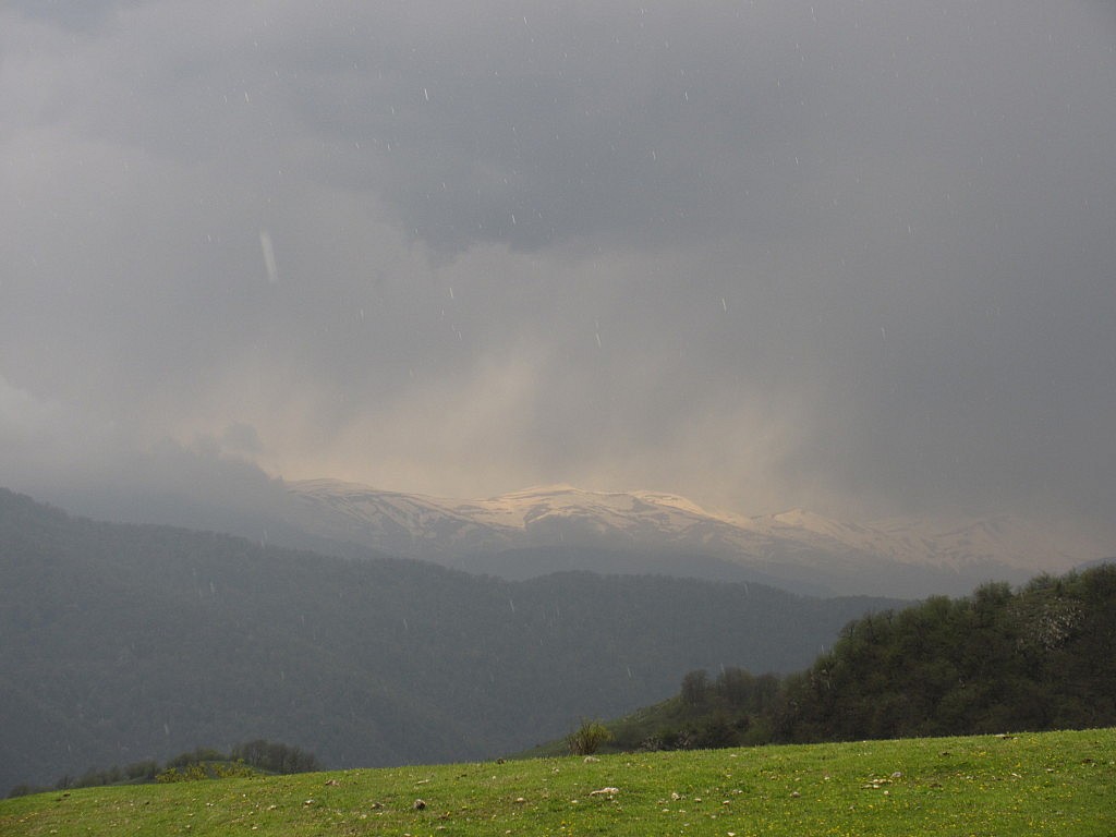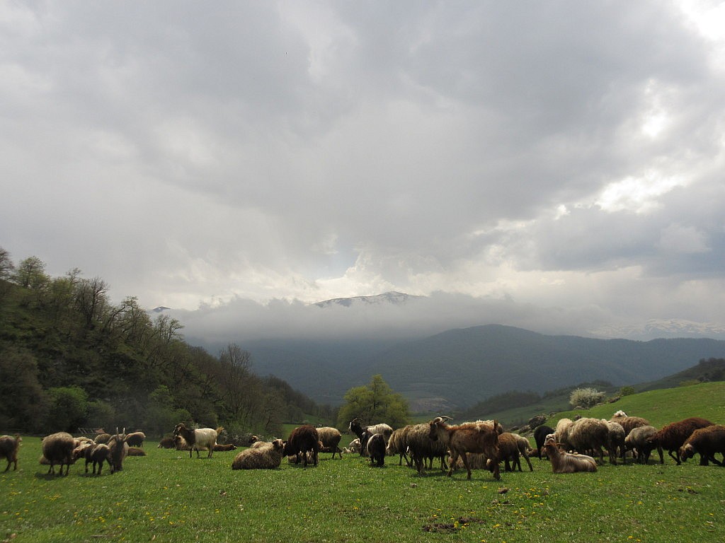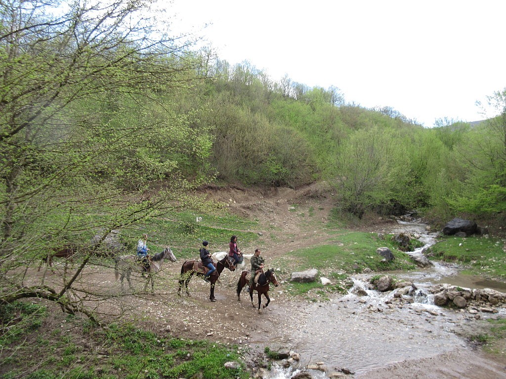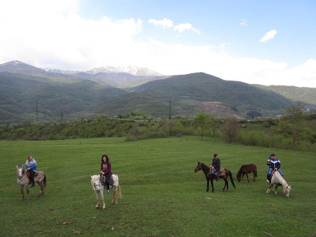 Am Samstag haben wir uns alle früh aus den Betten gequält, denn wir hatten am Vorabend entschieden, einen Tagestrip in die Berge zu machen. Das sollte eine organisierte Reit-Tour sein. Erst wollten wir es doch kurz abblasen, weil Gewitter für die Gegend angekündigt war, aber dann haben wir uns aufgerafft und sind doch los. Wir sind am Sewansee, dem größten Binnensee Europas (?), vorbei gefahren und dann in die Berge nach Dilijan. Dort standen zwei Jeeps und 10 Pferde für unsere Gruppe bereit. Wir mussten uns aufteilen, nur die eine Hälfte konnte reiten. Für die erste Runde zu Pferd haben die Organisatoren Leute gesucht, die schon mal auf einem Pferd saßen und etwas Erfahrung hatten und so bin ich an eines gekommen. Es ging kleine Straßen entlang, einen Berg hoch. Ich hab mich erstaunlich schnell wieder sicher gefühlt und so hat es super viel Spaß gemacht! Nach einer halben Stunde wurde gewechselt und wir sind dann zu Fuß gegangen oder mit dem Jeep vorgefahren. Oben haben wir an einer Rasthütte Halt gemacht. Es wurde ein Lagerfeuer entfacht und die Armenier haben Unmengen an Essen ausgepackt! So ähnlich erlebt man das auch hier in Georgien :) Wir fanden es ein bisschen schade, dass wir über vier Stunden dort oben verweilt haben ohne irgendeine besondere Aktivität. Wir konnten zwar die Pferde reiten, aber die wurden ja auch nicht munterer. Erst um sechs Uhr haben wir uns auf den Rückweg gemacht. Trotzdem war es insgesamt ein super Ausflug mit netten Leuten und lustigem wechselhaftem Aprilwetter! Ziemlich erschöpft war in der Marshrutka dann eine sehr schläfrige Stimmung. Doch kurz vor Yerevan wurde der Himmel zunehmend dunkler. Genau über Yerevan hing ein fettes Gewitter! Wir sind aus den Bergen nach Yerevan runter gefahren und es sah wirklich apokalyptisch aus! Es hat geblitzt und gedonnert und als wir in der Stadt waren, hat es geschüttet, als hätte jemand plötzlich den Hahn aufgedreht! Ganz leicht durchgeweicht sind wir bei Leonie angekommen, wo schon wieder gegrillt wurde. Wir haben uns kurz geduscht und sind dann direkt wieder los, zum Geburtstag eines Georgiers.