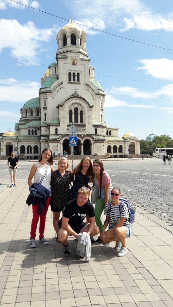 Übers Wochenende ging es nach Sofia, da am Freitag alle Freiwilligen aus Bulgarien in der deutschen Botschaft eingeladen waren. In Bulgarien werden eigentlich alle Strecken mit dem Bus zurückgelegt. Von 7-20:00 fährt jede Stunde ein Bus von Plovdiv nach Sofia für umgerechnet 7 Euro. Es gibt wohl auch Züge, aber wie uns oftmals berichtet wurde, sind diese sehr abenteuerlich und man muss viel Zeit mit einplanen. So brachte mich einer der Schüler, Yanko, den ich tagszuvor kennengelernt hatte, zum Busbahnhof. Meine Betreuerin rief ihn an, weil mir eine andere Lehrerin eine Karte von Sofia hätte geben sollen. Sie war sehr besorgt, da diese Karte mich nicht erreicht hatte und aus Spaß meinte er, er könne ja mit nach Sofia fahren und mich zur Botschaft bringen und da wohl alle sehr spontan sind saßen wir 20 Minuten später im Bus nach Sofia. Er hatte zwar nichts mit, aber wurde vom Unterricht freigestellt und wollte seine Oma in Sofia besuchen. Nach einer zweistündigen Busfahrt trafen wir Toni, eine andere Freiwillige aus Blagoevgrad wieder und fuhren zusammen zur Botschaft. Kennenlernen, viele Zettel, Einladungen, Projektbeschreibungen und bulgarisches Bildungssystem waren für die nächsten 2 Stunden Programm. Den Abend verbrachten wir gemeinsam, erhaschten einen ersten Blick in die Sofioter Innenstadt und aßen im „Happy“ (ein sehr beliebtes Restaurant) zu Abend. Die Nacht verbrachten Toni und Ich bei Seline, die von ihrer Schule eine große Wohnung zur Verfügung gestellt bekommen hat. Es war toll nicht alleine frühstücken und Abendbrot essen zu müssen. Den Samstag genossen wir wie echte Touristen. Mit allen Freiwilligen, die sich zu diesem Zeitpunkt in Sofia befanden, schlossen wir uns einer Stadtführung, der free Sofia tour, an. Zweieinhalb Stunden besichtigten wir die wichtigsten Gebäude und Parks und lernten einiges über die Stadtgeschichte Sofias. Der Rest des Wochenendes verging im Flug, picknicken im Park, einem kurzen Jazzkonzert vor der National Oper lauschen, im Art Cafê Grapefruitschorle trinken, lange Austausche über unsere vergangenen Tage und viel U-Bahn fahren.