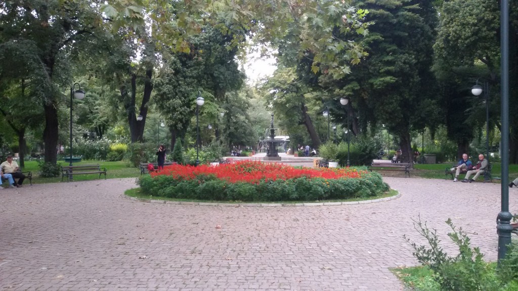 Am nächsten morgen holte mich Mariana ab, zeigte mir die Schule und stellte mir einige der Deutschlehrer und die Schulleitung vor. Danach machte ich mich alleine auf meine erste Entdeckungstour. Ich ging in den nahe gelegenen riesigen Supermarkt Leksi. Er ist zwei stöckig und ich irrte mind. eine Stunde durch die Gänge und kauft völlig überfordert nur Spülmittel und Kekse. Vom Supermarkt aus nahm ich den Bus ins Zentrum. Mir wurde zuvor erklärt, dass eine Busfahrt 1 Lew, also umgerechnet 50 ct. kostet, also betrat ich mit einem Lew in der einen und einem Stadtplan in der anderen den Bus. Ich drückte den Lew der Buskartenfrau in die Hand, doch offenbar setzte man sich in Bulgarien erst auf den Platz und die Dame kam zum Platz um die Karte zu verkaufen, somit war nicht nur ich überfordert. Sie redete aufgeregt auf bulgarisch auf mich ein und als ich einen meiner einzigen auswendig gelernten Sätze (Ich verstehe nicht) aufsagte redete sie einfach nur lauter. Ich zeigte ihr auf meinem Stadtplan, dass ich in die Stadt wollte und fuchtelte irgendwo über der Innenstadt rum. Sie redete weiter, nahm dann meinen Plan und lief damit im Bus herum und sprach mit den anderen Passagieren, bis zwei jüngere Mädchen mir in gebrochenem englisch erklärten wann ich aussteigen musste und mir in kyrillisch „Old town“ auf einen Zettel schrieben. So oder so ähnliche Situationen hatte ich den letzten Tagen öfter. Zwar wurde ich so gut wie nie verstanden, aber nicht nur im Bus, auch in der Uni auf der Suche nach einem zuständigen für die Sprachkurse und in der Stadt waren alle unglaublich freundlich, hilfsbereit und versuchten ihr bestmögliches. In der Stadt lief ich erst ein bisschen alleine herum, guckte mir das Amphietheater von oben an und setzte mich an einen Brunnen. Für den Nachmittag hatte ich mich mit zwei Schülern aus der Schule verabredet, die mich bei facebook angeschrieben haben. Nachdem sie mich versucht hatten anzurufen und ich deutsch ins Handy gesprochen hatte (leider erfolglos) drehte sich mein Sitznachbar auf der Bank um und so lernte ich Pankow, seine Frau und seinen Schwager Ilin kennen. Pankow arbeitet seit längerem in Deutschland als Tischtennis- und Sportlehrer, er war nur die Woche zurück in Plovdiv in seiner Heimat. Ilin ist schon im Ruhestand, er hatte vor 30 Jahren in Deutschland als Masseur beim HSV und danach in einer Rehaklinik gearbeitet. Nun wohnt er wieder in Bulgarien. Er hat erzählt, dass Deutschland zwar von den Regeln, Gesetzen und der Ordnung besser wäre, aber seine Heimat immer in Bulgarien sein wird. Außerdem meinte er, dass die Bulgaren ein wunderbar gastfreundliches Volk sein. Zum Schluss gab er mir noch seine Nummer, für alle Fälle. Kurze Zeit später kamen die beiden Schüler Yanko und Triffon und zeigten mir ein bisschen die Stadt.