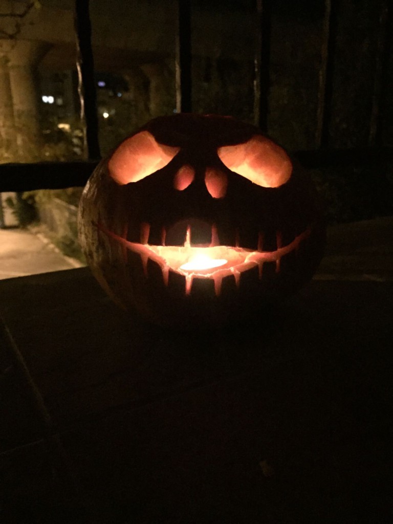 mal protestierten alle anderen Teilnehmer (inklusive mir), die schon in vorfreudiger Erwartung an die Fratze des beleuchteten Kürbis dachten. Gegenüber von Johanna versuchen Leonie, Toni und Anja ihr Glück an einem zweiten Kürbis mit einem weitaus stumpferen Messer aus dem Repertoire des Hostels. Ich beginne nach ein wenig übermotiviert die schon ausgeschnittenen Deckel der Kürbisse zuzerhacken und gerade als ich das letzte Stückchen um beide Strunken der Kürbisse kleinengehäckselt hab fragt Anja mich was ich da eigentlich machen würde. Auf die Antwort unser Abendbrot zubereiten starren mich alle fassunglos an. Normalerweise behält man wohl die Deckel und setzt sie wieder auf den ausgehöhlten Kürbis, hoppala. Die deckellosen Kürbisse leuchteten trotzdem wunderbar (nacheinander) mit dem einzigen wechselnden Teelicht und der Kürbis schmeckte trotz fehlendem Backofen (daran hab ich mich langsam schon gewöhnt) wunderbar in der Pfanne. Und auch die Halloweenspotifyplaylist und die Haarklammern in Form einer Skeletthand von Jumbo taten ihr bestes um uns auf Halloween einzustimmen.