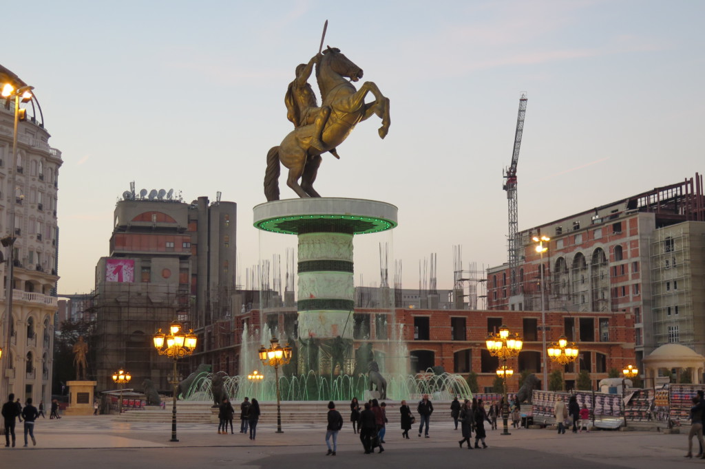 „Skopje ist eine der ältesten Städte des Landes und bietet einen besonderen Charme in der Stadtarchitektur.“ Ebenso wie die Flagge Mazedoniens erwartete uns eine strahlende Sonne als wir mit unserem kleinen Reisebus nach Skopje reinfuhren. Während wir vor einer 23 Meter hohen Statue mit dem Namen „Krieger auf Pferd“ stehen (zuvor hatte mein Vater mir noch ein kleines Rätsel aufgegeben, ein Mann der aus Mazedonien kommt und mit „A“ anfängt und „oße“ aufhört (naa, wer erräts?) und den eben diese Statue darstellt) die von einem erleuchteten künstlichen Wasserfall und Löwenstatuen verziert einen imposanten Anblick bietet. Irgendwie habe ich mir diesen besonderen Charme in der Stadtarchitektur, der im Internet auf einem der unzähligen Touristenseiten angepriesen wurde, anders vorgestellt. Allerdings fiel mir auf, dass auch nicht beschrieben wurde was für ein Charme diese Stadt ausstrahlen sollte. Das man sich wie in Disneyland fühlen wurde hätten wir allerdings nicht erwartet. Um es in einem Satz zusammen zufassen, Skopje wirkt inszeniert. Die Stadt mit der wahrscheinlich höchsten Statuendichte Europas und weißen Häusern mit hohen Säulen, die die Epoche des Barocks, der allerdings nie in Mazedonien stattgefunden hat, darstellen sollen, Springbrunnen und wie gesagt sehr vielen Skulpturen, die aber größtenteils erst in den letzten 10 Jahren gebaut wurden. Zwei Anekdoten, die uns der Stadtführer der Free Skopje Tour berichtet stützen den Eindruck der Stadt. Die Statue „Krieger auf Pferd“ ist momentan die höchste Alexander der Große Statue (wer hats erraten?) in Europa, allerdings wird in Griechenland eine höhere gebaut, doch sobald die wird Mazedonien es sich natürlich nicht nehmen lassen noch eine höhere zu bauen. Nebenbei bemerkt, 10,4 Millionen Euro hat diese Statue gefressen und wurde ebensfalls im Projekt „Skopje 2014“ gebaut. Jedoch sind nicht alle Einwohner dieser Stadt so zufrieden und glücklich mit den (ich erlaube mir das Wort kitschig zu benutzen) Skulpturen. An vielen Törbögen und Statuen sieht man das Werk zerplatzter Farbbeutel. Die zweite war (hoffentlich) mehr ein Witz unseres Stadtführers, als er uns berichtet, das wer in Skopje eine Baugenehmigung wolle. unterschreiben müsse mindestens 5 Statuen auf sein Haus zu bauen. Ahh ja. Jedoch ist nicht ganz Skopje in diesem Stil gebaut, einen großen Teil des Wochenendes verbrachten wir im „Old Bazar“, ein Stadtteil, der mich an das Kapanaviertel in Plovdiv erinnert und an dem sich Bars, Bäcker und Geschäfte für Mode, Schmuck und Mitbringsel an der Pflasterstraße entalng reihen. Einen Großteil verbringen wir auch in kleinen lokalen Restaurants und futtern uns voll mit …. einem typisch mazedonischen Bohneneintopf, Schopskasalat, der wie Seline erzählt eigentlich in Bulgarien für Touristen erfunden wurde um die bulgarische Flagge nachzuahmen und Nafura, geröstetes und kleingeschnittenes Weißbrot mit geraspeltem Schafskäse.