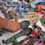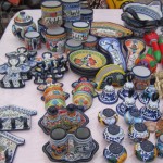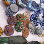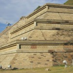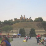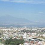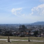 Bevor man sich auf den Weg zur Spitze des Hügels macht, kommt man zwangsläufig an den vielen kleinen Souvenir-Ständen vorbei. Auf den Tischen in der Auslegeware vermischen sich die Religionen. Zwischen Glocken aus Keramik und Kruzifixen finden sich kleine Tonmasken, die den Sonnengott Tonatiuh repräsentieren. Die Griffe der Messer mit nachgemachten schwarzen Steinklingen stellen den Vulkan Popocatepetl als legendären Aztekenkrieger dar. Oben auf dem Hügel angekommen hatte ich einen wunderbaren Blick auf diesen Vulkan.