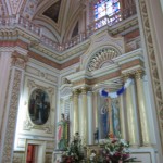 Von hier oben sieht man aber nicht nur Berge. Sondern auch Kirchen. Wer glaubt, Puebla habe viele Kirchen, der hat Cholula noch nicht gesehen. Man sagt, in Cholula gäbe es 365 Kirchen, für jeden Tag eine. Roberto meinte, es seien wohl eher 365 Kirchtürme. Ob das allerdings wirklich so sei, wisse er auch nicht. Heute warfen wir nur einen Blick auf das Franziskanerkloster San Gabriel und in die Kirche ‚de Nuestra Señora de los Remedios‘ – der Jungfrau der Heilmittel – auf dem Hügel, beide aus dem 16. Jahrhundert. Letztere wurde von den Eroberern aus den Steinen des Tempels erbaut, der ursprünglich auf der Pyramide gestanden hatte. Damit wollten die Spanier die Überlegenheit ihrer Religion über die der Eroberten zum Ausdruck bringen. Damals eine gängige Praxis.