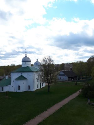 Am nächsten Tag haben wir herrliches russisches Frühstück bekommen. Kascha (Porridge) mit Marmelade, Joghurt, Brot mit Pilz-Frischkäse und Wurst, Pfannkuchen mit saurer Sahne, Muffins und Tee. Das war natürlich viel zu viel, aber einen Teil konnten wir zum Glück mitnehmen. Gestärkt haben wir uns auf den Weg zum Erlöser-Euthymios-Kloster gemacht. Die ganze Klosteranlage ist sehr schön, groß und blumig und dort befinden sich mehrere kleine Museen, in denen es unter anderem Glocken, alte Bücher und sowjetische Propaganda-Plakate zu sehen gibt.