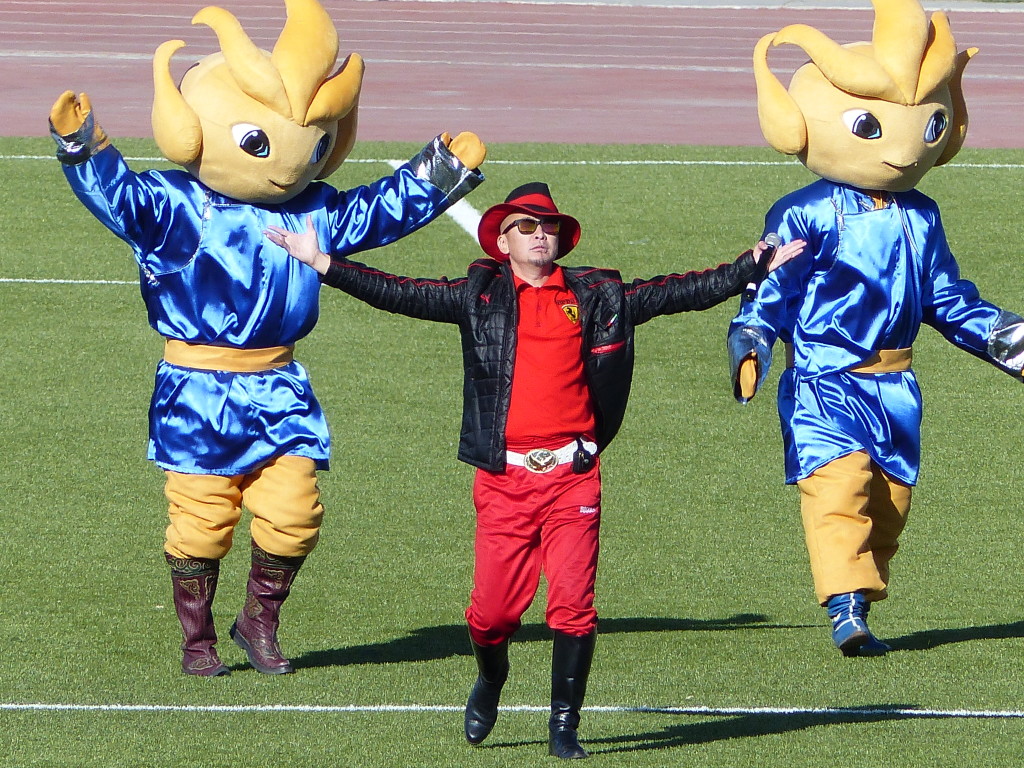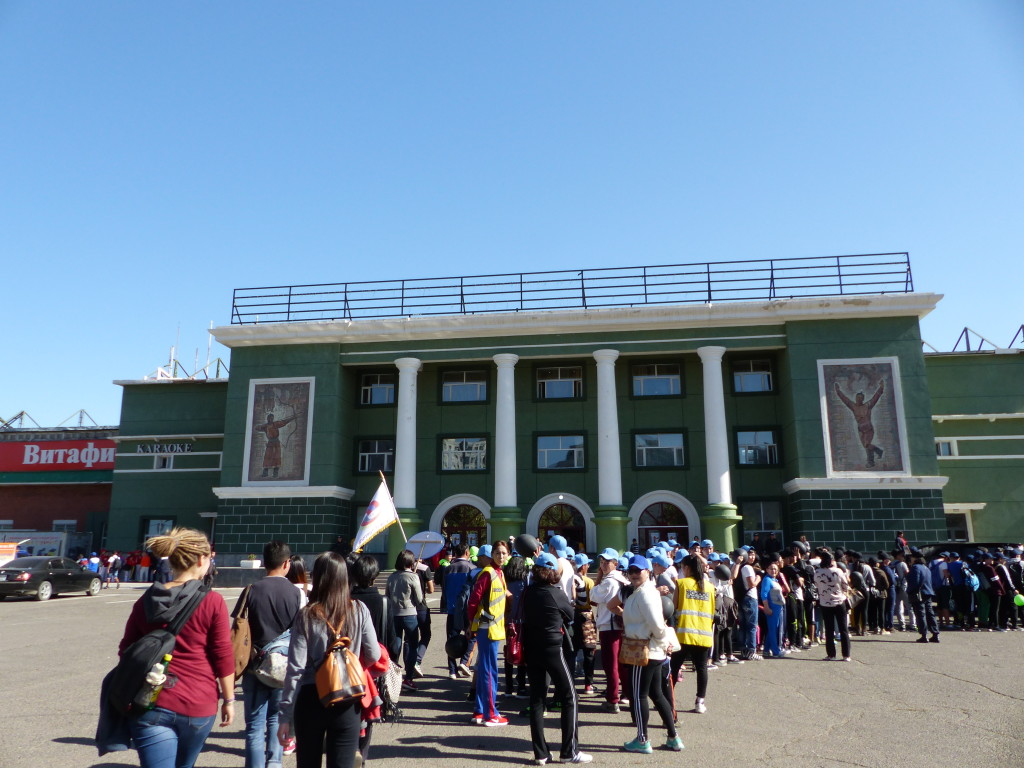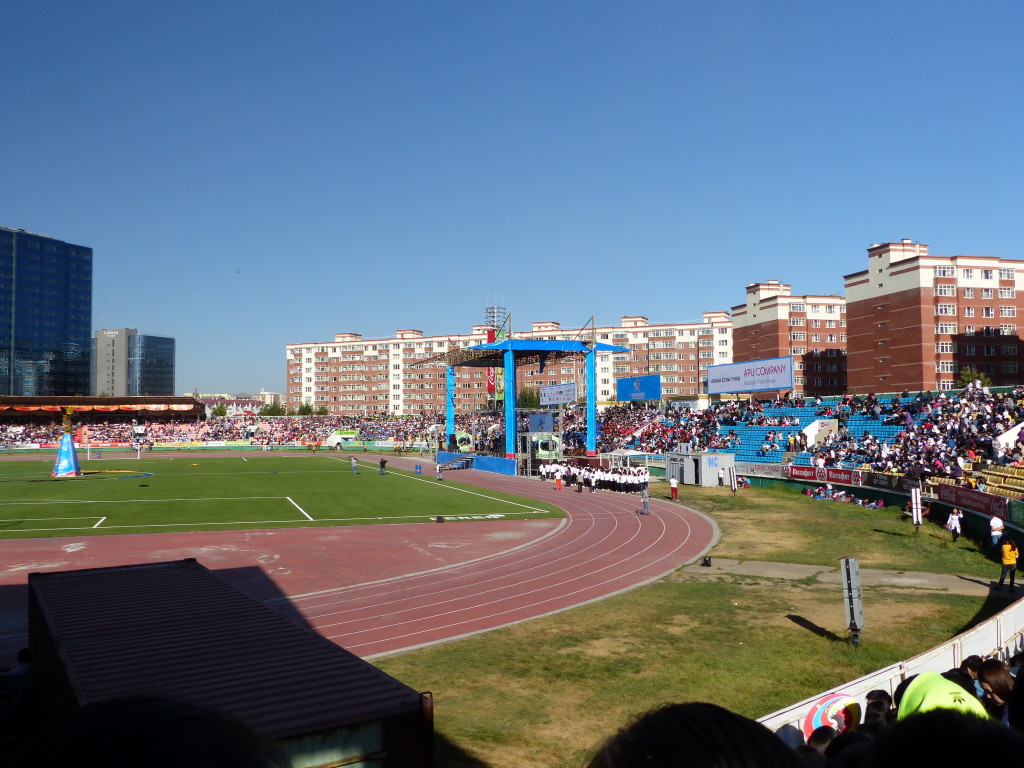 Nach einer kurzen Stärkung bei Milchtee und Gebäck beschloss ich dann, meiner Müdigkeit den Kampf anzusagen und mich nicht aufs Ohr zu hauen. Stattdessen begleitete ich Miri plus meine halbe Schule zu dem Stadion in Ulaanbaatar, wo so eine Art Olympische Spiele in den nächsten Tage ausgetragen werden. Dazu sind Schulmannschaften aus der ganzen Mongolei gekommen und haben heute den Anfang der Spiele bei feierlichem Einlaufen und Musikshoweinlagen gefeiert- das war schon irgendwie cool.