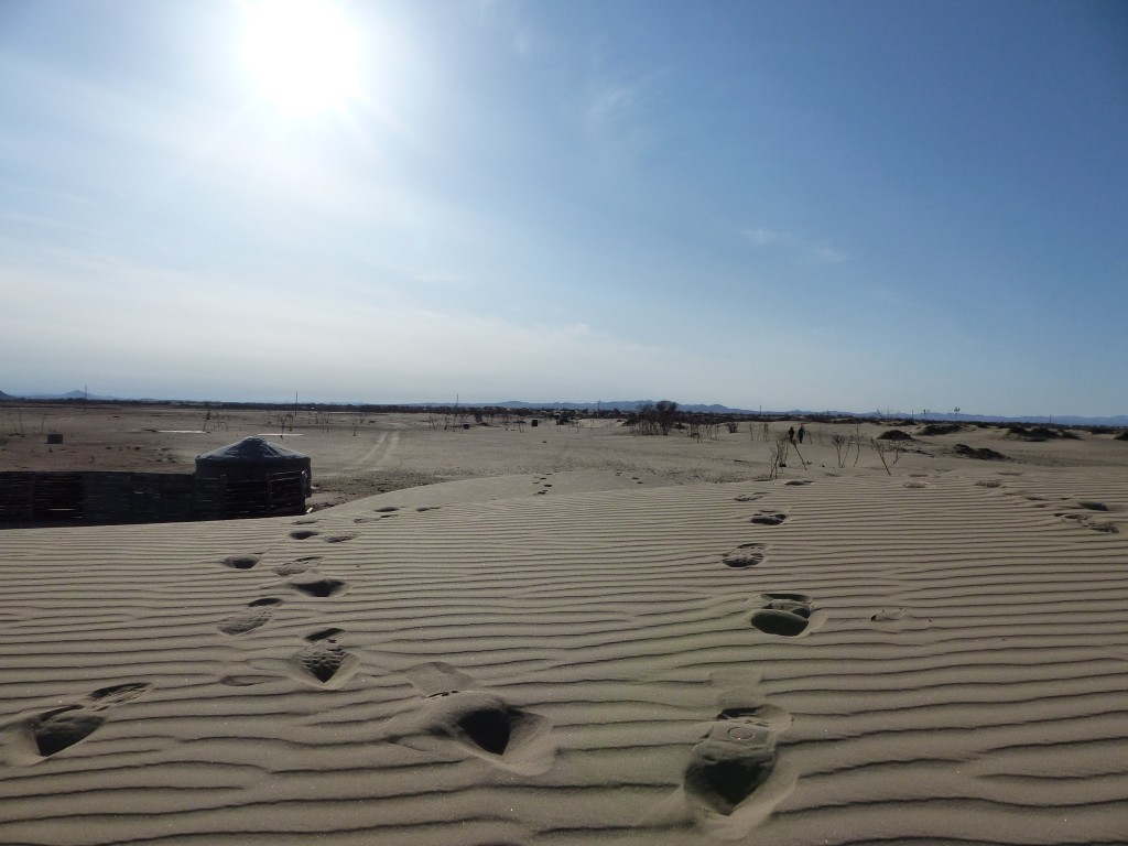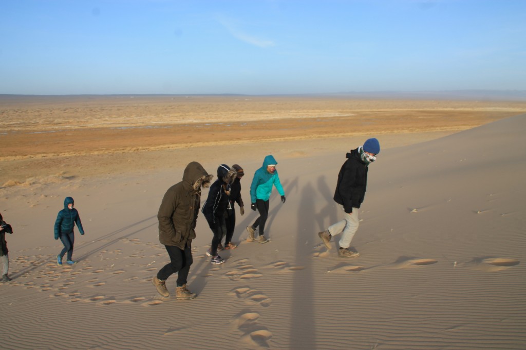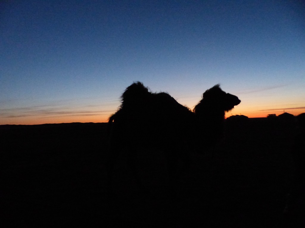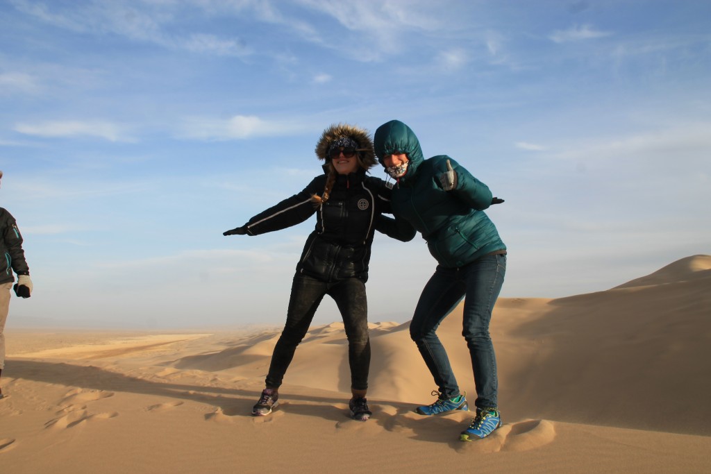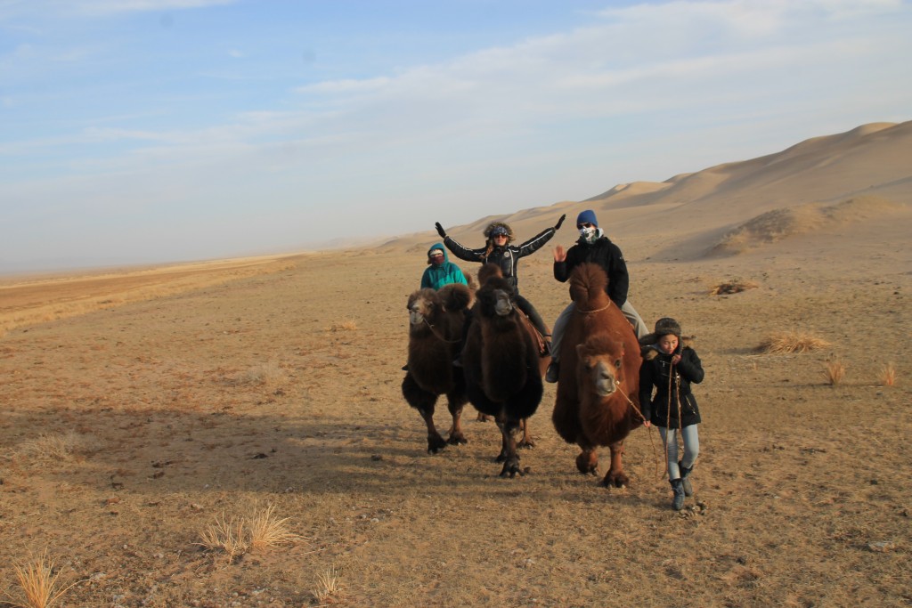 Nach einem Abend mit Bier, Wodka, herumfliegenden Männchen und Ziegen anmähenden Freiwilligen ging es am nächsten Morgen etwas später los in Richtung Khongoriin Els. Das auch unter dem Namen „Singende Dünen“ bekannte Dünenfeld zieht sich über 180 km und wandert dabei langsam,aber kontinuierlich von West nach Ost. Dort angekommen blieb nur kurz Zeit, die Dünen zu bestaunen. Mein erster Kamelritt stand an! Freudig stieg ich also auf mein Kamel, das sich dann doch als ein erstaunlich bequemes Reittier entpuppte. Gemütlich trotteten die Kamele dann mit uns zu einer größeren Düne, die wir dann sogleich erklimmten. Gar nicht so einfach bei dem ständig wegrutschendem Sand, aber der Ausblick lohnte sich allemal.