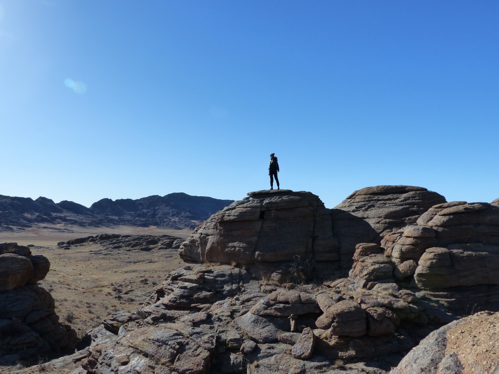 Am Nachmittag dann Stop Nummer 1 am Baga Gazariin Chuluu, ein sich auf einer Fläche von 300km² erstreckendes Granitgebirge. Ringsherum nichts außer flache, sich scheinbar ins Unendliche erstreckende Steppe. Stehend und staunend mit dem starken Wind im Gesicht schaute ich zuerst minutenlang nur in die Ferne. Was für ein weites, unberührtes Land sich da vor mir auftat – erstaunlich.