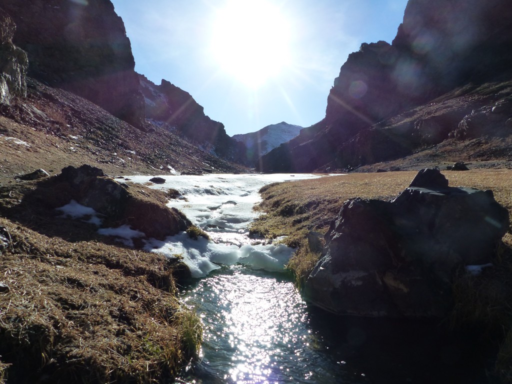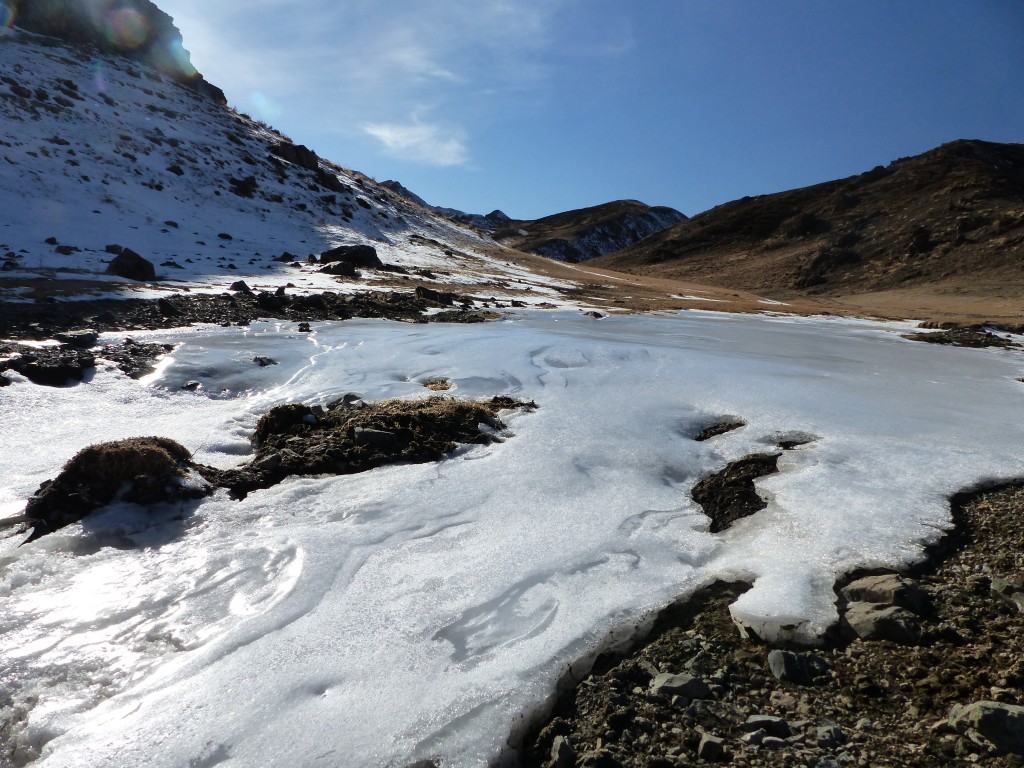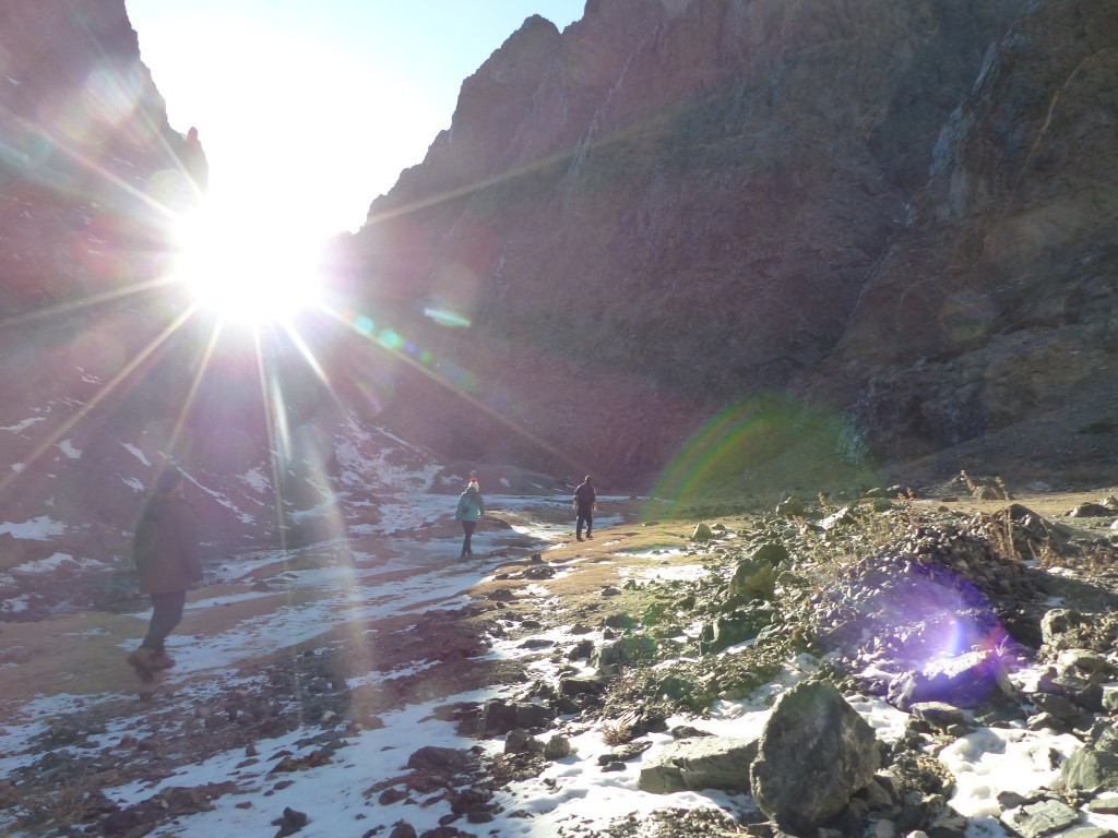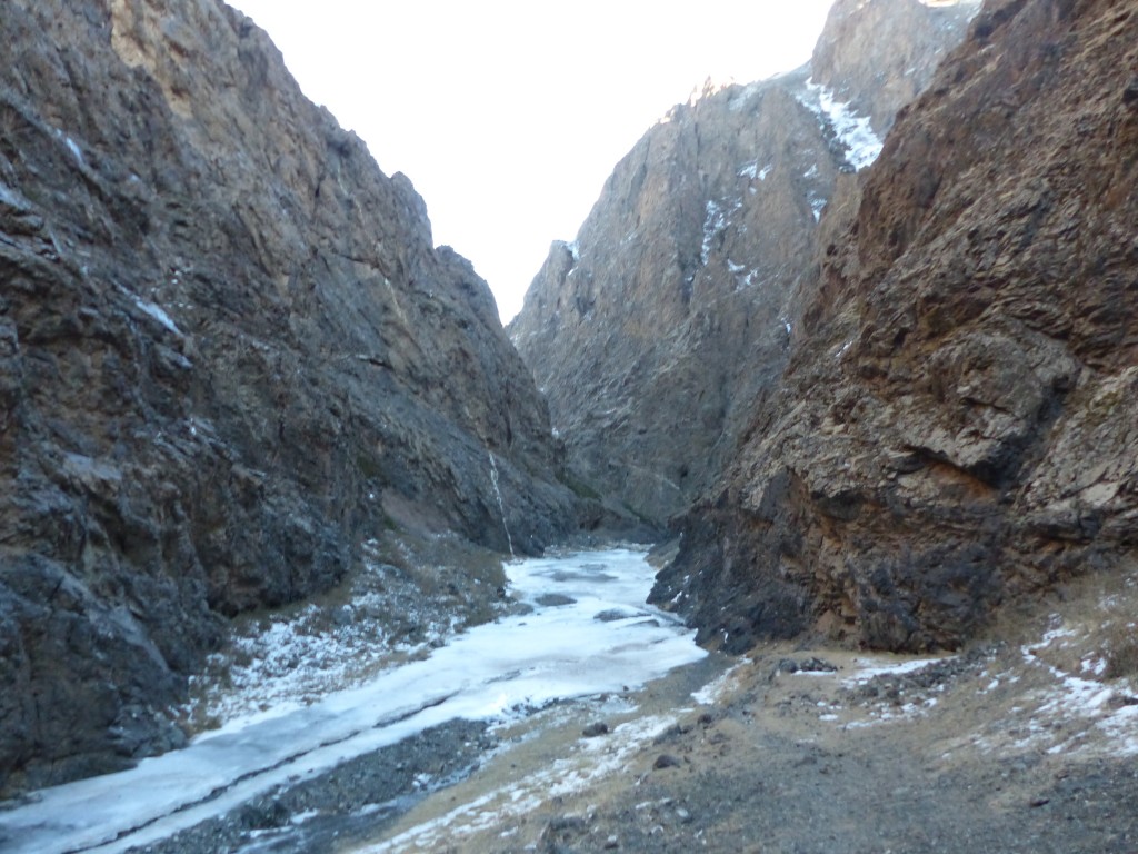 Zur Geierschlucht, auch Yoliin Am Schlucht, ging es an Tag 3. Nach einer doch langen Fahrt kam der kleine Fußmarsch in die Schlucht zwischen den Gipfelns des Gebirgszugs Gurvan Saikhan uns wohl allen gelegen. Der Bach, der sich zu unseren Seiten schlängelte, war mal von einer dickeren, mal von einer dünneren Eisschicht überzogen. So also nahm auch ich ein kleines Fußbad. ^^