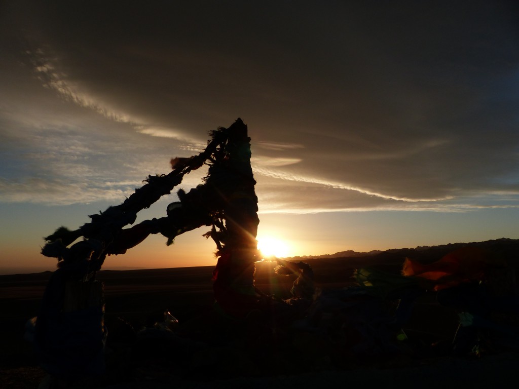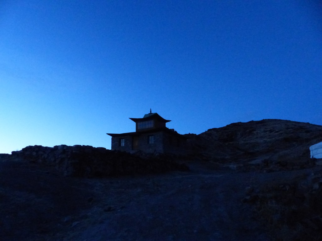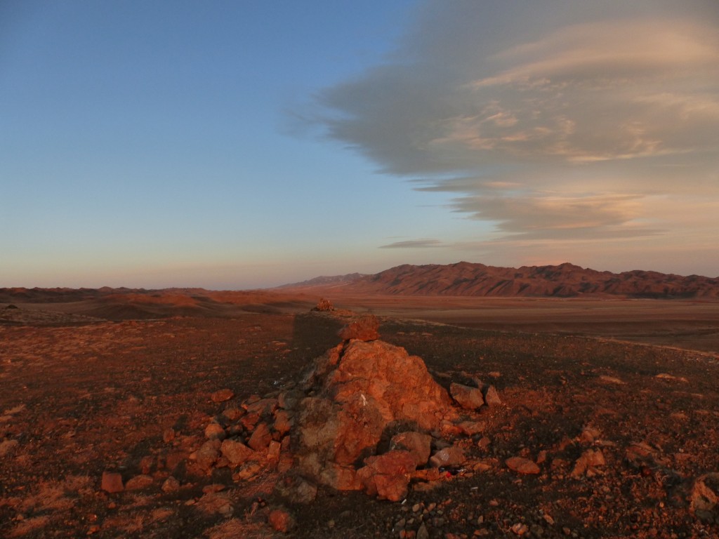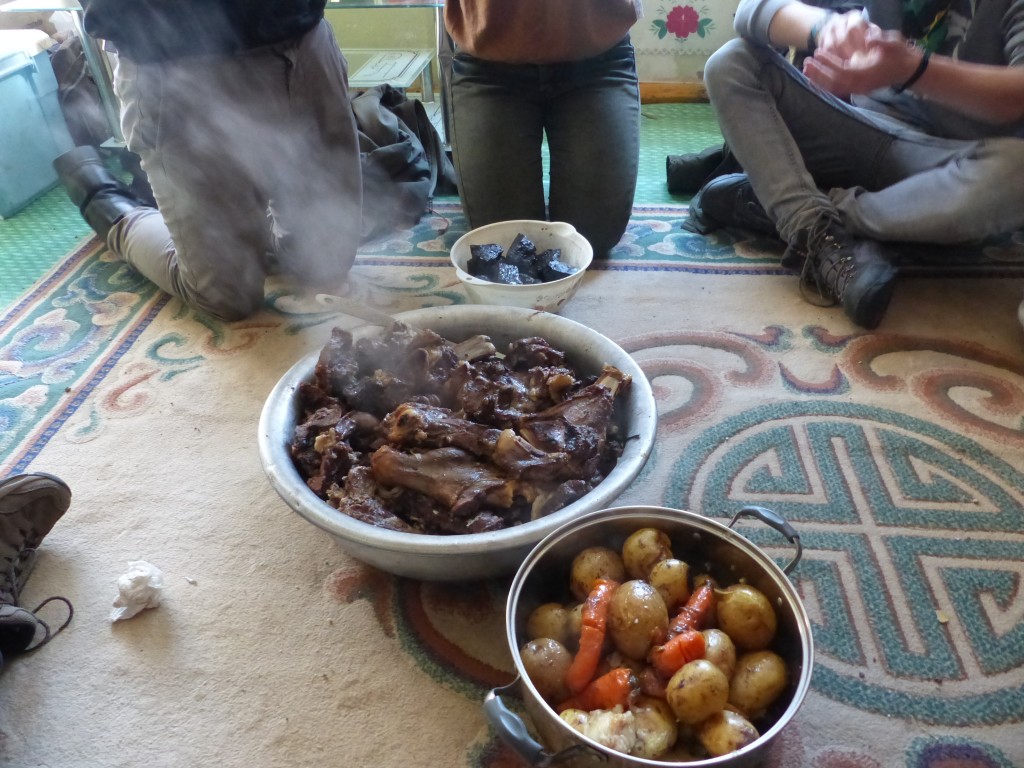 Bei der Hirtenfamilie, wo wir die Nacht verbrachten, kamen wir am nächsten Tag in den besonderen Genuss, das mongolische Essen Khorkhog probieren zu dürfen. Dafür wurde erst eine Ziege geschlachtet, die dann zerlegt wurde. Das Fleisch wurde dann mit Zwiebeln, Möhren, Kohl, Kartoffeln und heißen Steinen aus dem Ofen gegart, wodurch es ein tolles rauchiges Aroma bekam und wirklich lecker schmeckte. Erst spät am Nachmittag brachen wir dann gestärkt auf und besichtigten in der Abenddämmerung das Ongii Kloster. Leider wurde auch dieses Kloster 1937 unter den Sowjets zerstört. In dem friedlichen, total weltabgewandten Tal, wo also einst Lamas geschäftig ein und ausgingen und sangen und beteten, standen jetzt nur noch Ruinen und kein Laut war zu hören. Kein Wunder, dass die abendliche Stille auf mich eher bedrückend wirkte.