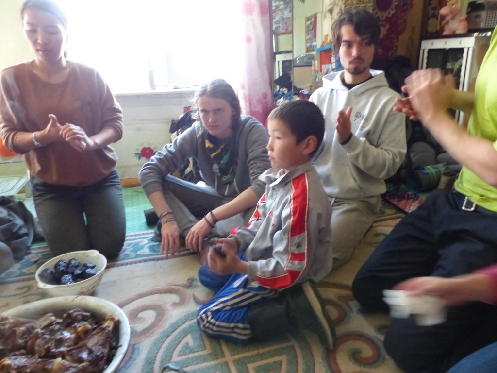 Unser Nachtlager durften wir bei einer Nomadenfamilie in der fürs Land typischen Behausung, der Jurte, aufschlagen. Das ist eine Art rundes Zelt, welches innen aber groß genug für einige Betten und Schränke ist. Ein Ofen steht in der Mitte, der zum Kochen genutzt wird und die Jurte beheizt. Eine wirklich gemütliche Angelegenheit also, vorausgesetzt der Ofen geht nicht aus.