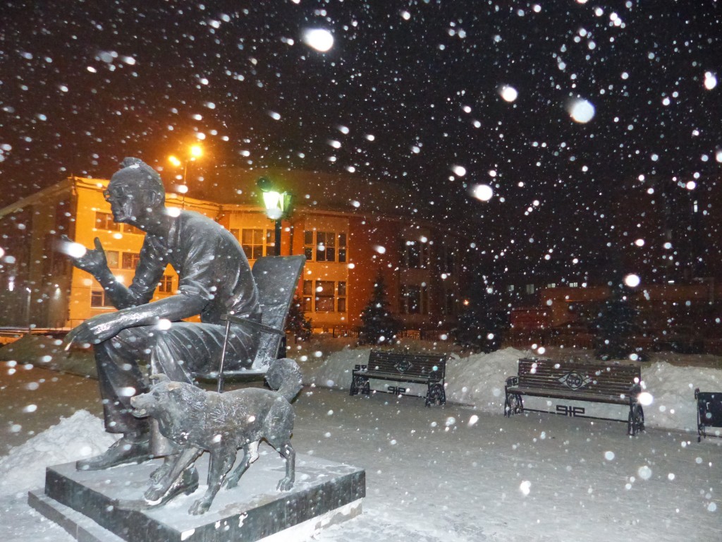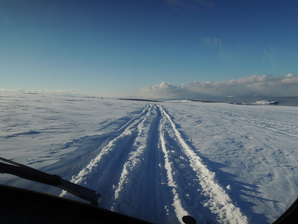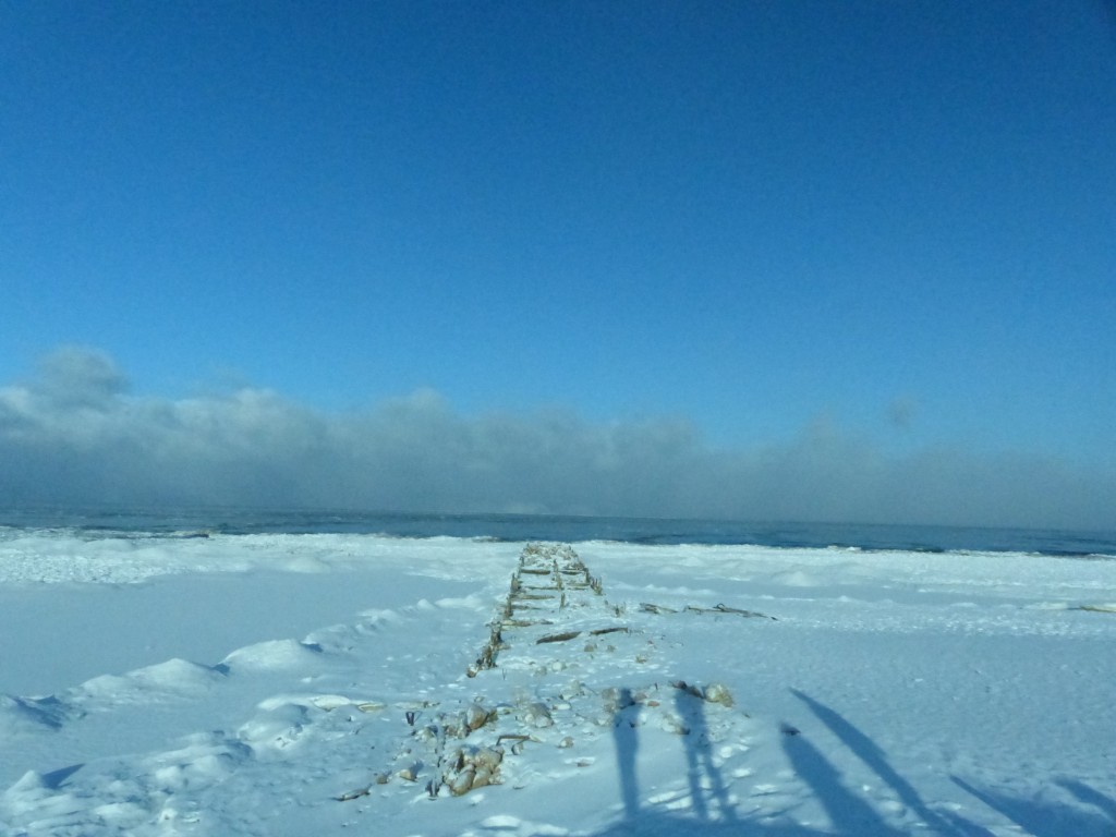 Der 25. dann Ausflugstag. Mit zwei meiner seit der Gobi in mein Herz geschlossenen Russenbussen ging es durch den tiefen Schnee quer über die Insel.Erster Stop: ein Gulag, ein ehemaliges Arbeitslager zur Zeiten der Sowjetunion, in dem Andersdenkende Zwangsarbeit verrichten mussten. Diese hier war ein Fischfang und -verarbeitungslager und damit eins der härtesten, kaum verwunderlich, wenn man den sibirischen Winter einmal miterlebt hat. Heutzutage ist bis auf einige Bodenplatten nichts mehr von all dem zu erkennen.
