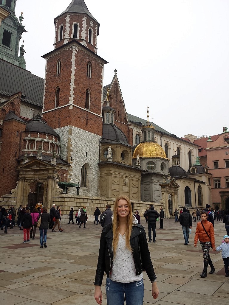 Am nächsten Tag mussten wir uns unbedingt das Schloss Wawel anschauen. Also, nichts wie auf zum Schloss! Auf dem Weg dorthin sahen wir viele atemberaubend schöne Kirchen und eigentlich hatte man das Bedürfnis überall mal reinzuschauen. Das Schloss Wawel sah von hinten erstmal gar nicht so beeindruckend aus. Klar, es war schön, aber dort gibt es nur schöne Häuser, also ist es noch nicht so heraus gestochen. Das hat sich aber schnell geändert, als wir die Wawel-Anhöhe hoch gestiegen sind. Was für eine Pracht und Anzahl von Gebäuden, da war ich tief beeindruckt. Was mich noch mehr beeindruckt hat, war die 1000 Meter-Touri-Schlange. Soviel Zeit hatten wir dann doch nicht und deshalb mussten wir leider auf die Führung durch das Schloss verzichten.