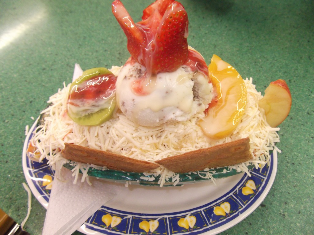 Heute war ich das erste Mal auch in einer Frutería, die es hier eigentlich an jeder Ecke gitb, und Andres hat mich eingeladen. Man muss aber dazu sagen, dass an dem Obstsalat eigentlich nichtmal die Hälfte Obst ist, weil man dazu Creme, süße Fruchtsoße, Eis und KÄSE ist. Ich hab meinen zwar ohne Creme bestellt, aber vergessen zu sagen dass ich auch keinen Käse mag… Das heißt auf meinem Obst war vor allem ersteinmal ein riesen Berg Käse :/ also nicht unbedingt so zu empfehlen 😀 aber hier ist man Käse wirklcih zu ALLEM was süß ist, also heiße Schokolade oder einfach so Käse mit so etwas wie Brombeermarmelade und Karamell…Naja leider war dann auch noch die Hälfte des Obst Papaya und die mag ich eigentlich auch überhaupt nicht! Also eher so naja, brauch ich nicht so bald wieder 😀 und wenn, dann ohne Käse und ohne Papaya ;)…