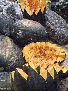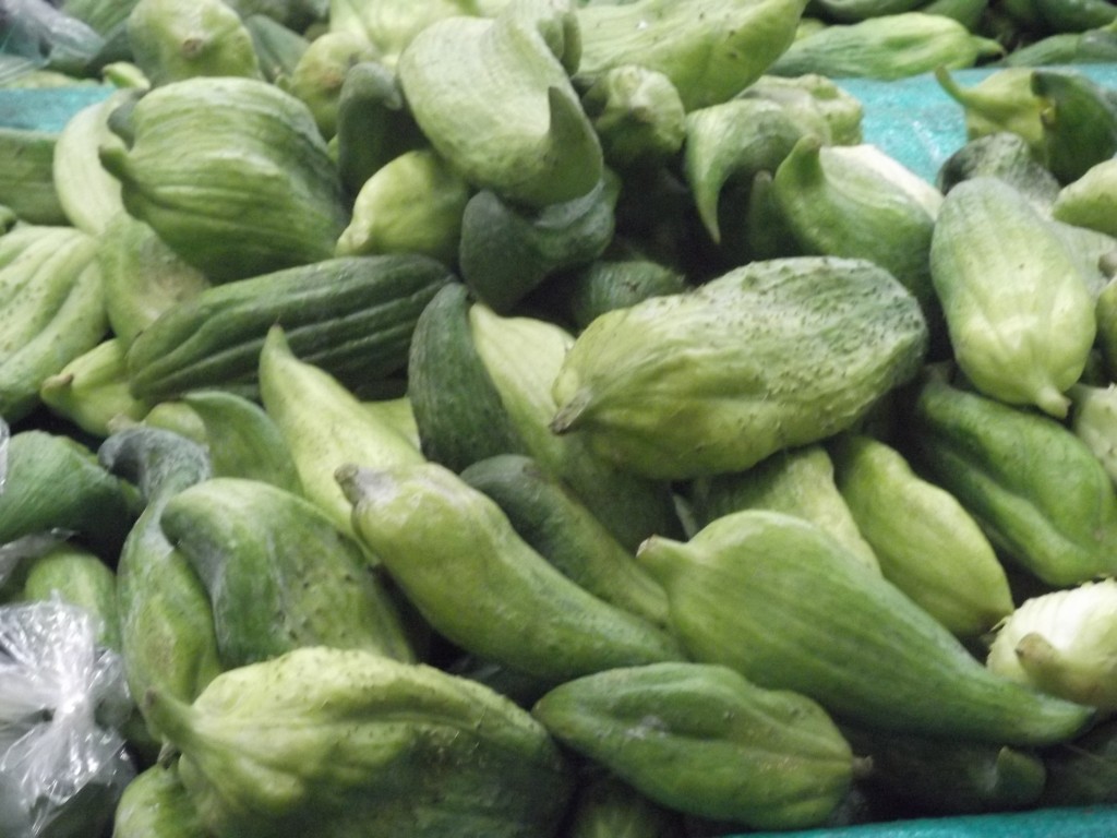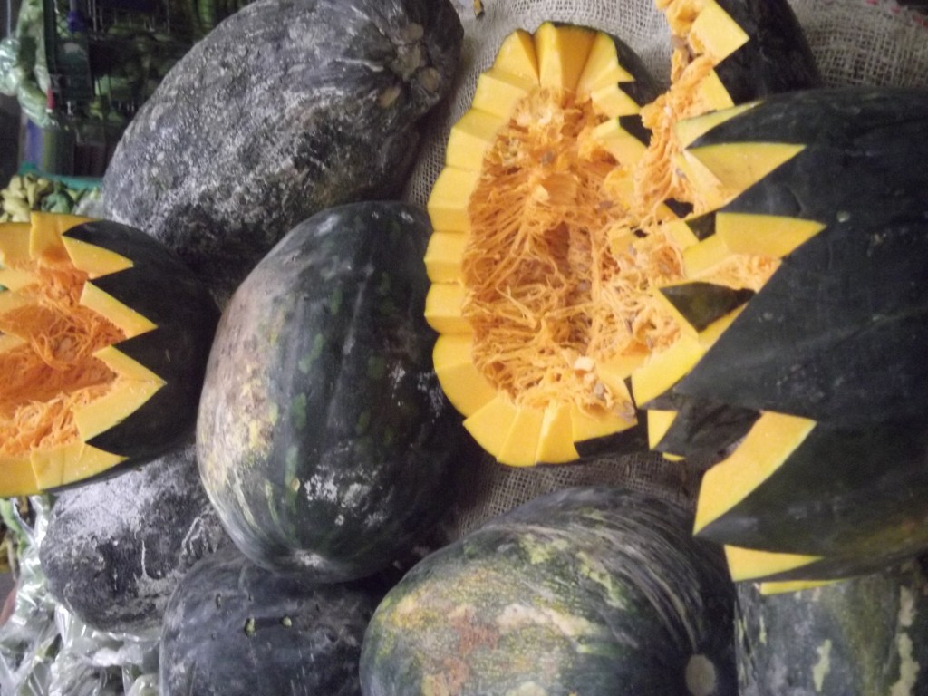 Und jetzt zum Gemüse 😉 das links ist Pepino ( sprich so etwas wie Gurke) das man aber kocht und schmeckt wirklich lecker! Das rechts kennt ihr mehr oder weniger, das ist ein rießen Kürbis, ich weiß nicht obs die Sorte auch in Deutschland gibt…