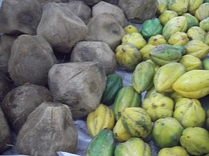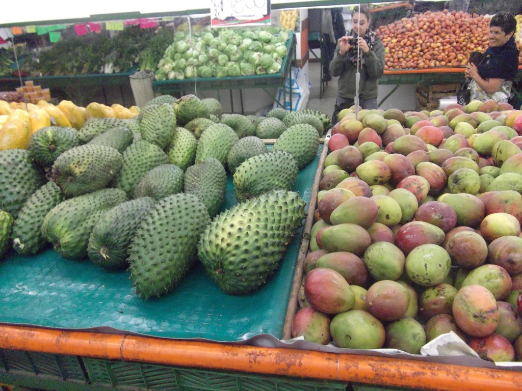 Auf dem rechten Bild seht ihr dei großen Papayas dies hier gibt ( und die ich überhaupt gar nicht mag!!). Das in der Mitte ist Baumtomate, trinkt man auch als Saft und schmeckt ziemlich sauer und auch ein bisschen gewöhnungsbedürftig, aber ok :). Rechts aussen ist Curuba, richtig lecker und man kann es entweder löffeln oder auch als Saft ( mit Milch) trinken.