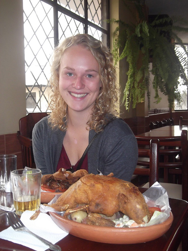 Silvester haben wir auch in Atuntaqui verbracht :). Am 31. Dezember sind wir morgends ins Schwimmbad, das war super weil wir dort ein Schwimmbad mit Whirlpool und sogar Dampfbad gefunden haben! Danach gabs dann für alle Nicht-Vegetarier eine regionale Spezialität: Cuy ( Meerschweinchen) die werden hier außerdem auch am ganzen Stück reserviert und scheinbar soll es ähnlich wie Hühnchen schmecken…
