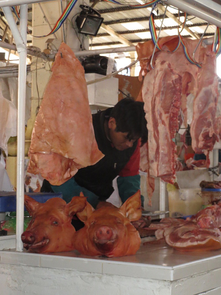 links Schweineköpfe, wir wurden ausgelacht weil wir es so ecklig fanden dass wir es fotografiert haben 😀 und rehcts ist die Frau gerade damit beschäftigt unsere Kokosnuss zu schälen damit wir den Saft trinken können und wir habne auch gelernt dass man um die Kokosnuss zu öffnen sie in eine Tüte macht und dann mit Kraft auf den Boden wirft 🙂 funktioniert ganz gut ;).