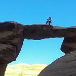 - Eine der natürlichen Felsbrücken im Wadi Rum – von oben sieht sie relativ stabil aus!