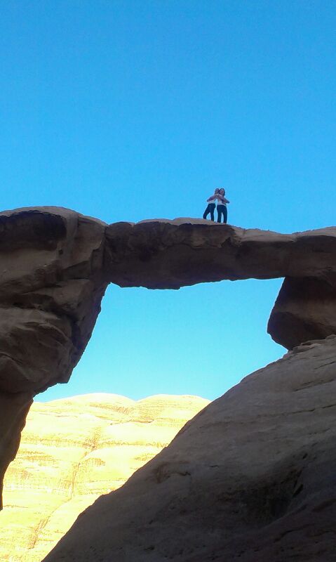 - Eine der natürlichen Felsbrücken im Wadi Rum – von oben sieht sie relativ stabil aus!