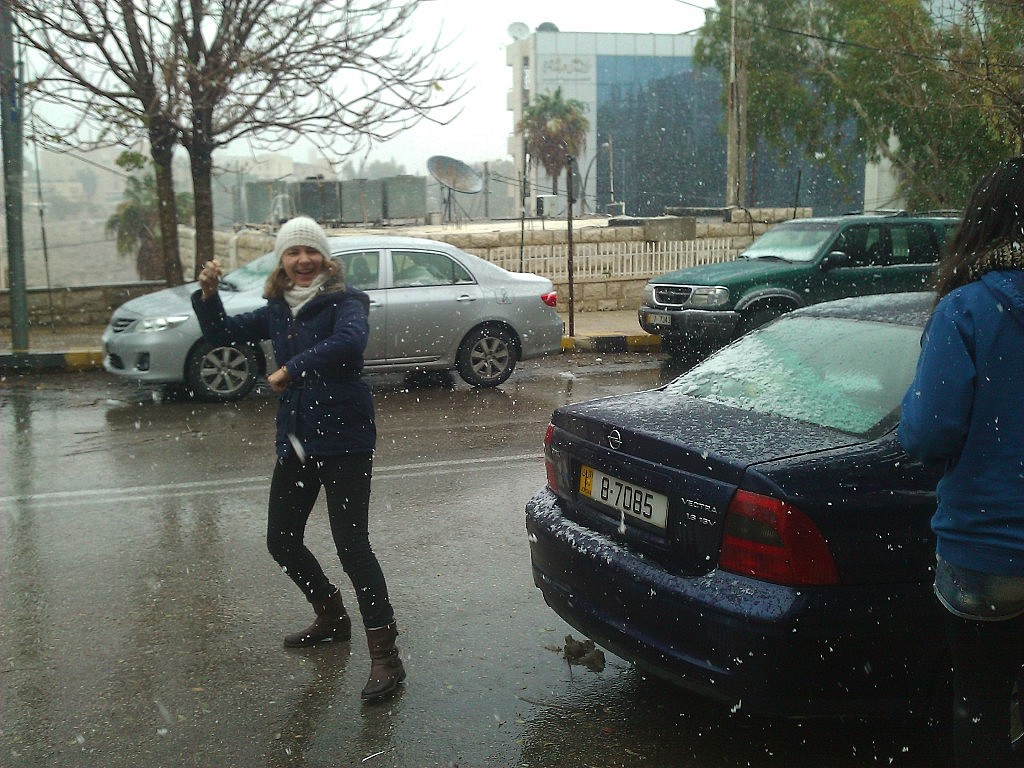 An den nächsten Tagen schneite es noch heftiger, die Straßen waren komplett autofrei, und am Samstag-Abend wagten wir uns noch einmal bei heftigem Schneefall vor die Tür. Das Bild, das sich uns bot, war einmalig: Jordanier standen mit ihren Handys in den Türen und filmten ungläubig das Treiben, die Leute feierten auf dem ersten Zirkel und in Rainbow-Street, bauten Schneemänner, warfen Schneebälle und freuten sich wie kleine Kinder.