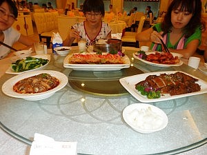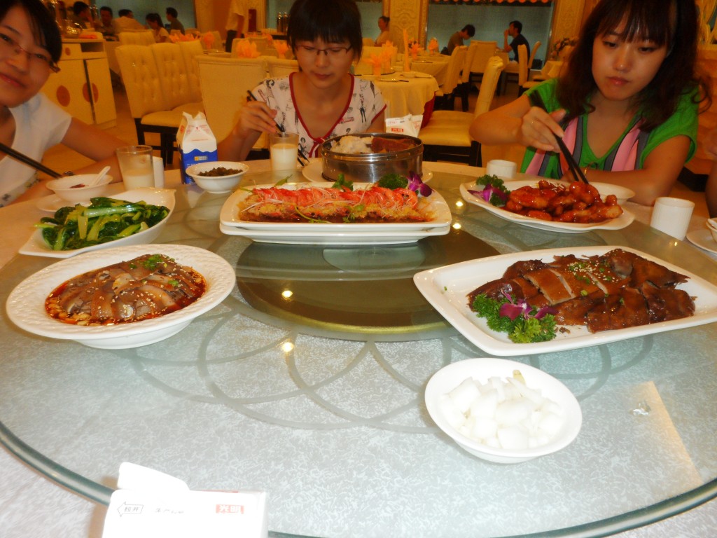 Dass ich auf dem Weg dorthin einige Male beinahe überfahren worden wäre, wurdein dem Moment belohnt, als wir das Restaurant betraten. Die adrette Kellnerin führte uns durch den hell erleuchteten, überwiegend in Weiß gehaltenen Saal, den verspiegelte Wände mit grazilen Mustern einfassten. An unserem Tisch warteten bereits ein paar Lehrerinnen, die an der Wuhan Middle School Spanisch, Französisch, Deutsch oder Englisch unterrichten. Reihum durfte ich mich alsbald in der jeweiligen Unterrichtssprache unterhalten, und da man seitdem weiß, dass ich mehr als nur Deutsch sprechen kann, hat sich mein Aufenthalt sozusagen in ein Intensiv-Sprachtrainingslager verwandelt. Wer hätte gedacht, dass ich einmal so dankbar dafür sein würde, den Französisch-Leistungskurs besucht zu haben. Wenn es nur mit dem Chinesisch genauso flüssig laufen würde! Wie dem auch sei, abgerundet wurde unsere multinationale Runde dadurch, dass die Bedienungen im Minutentakt neue, aufwendig angerichtete Speisen auf dem Tisch drapierten.