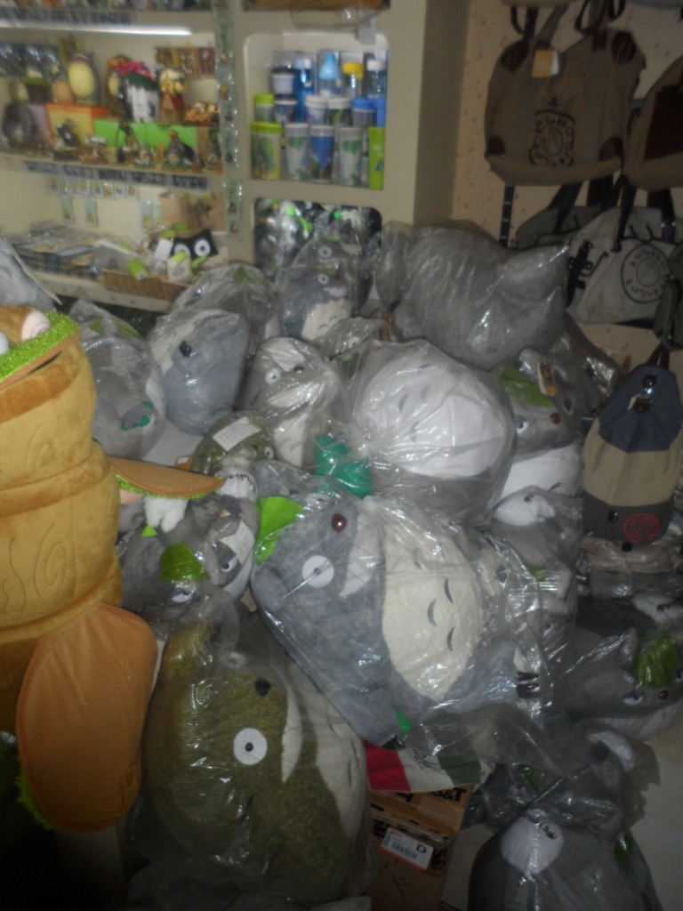 Wenige Minuten später fand ich mich dann in einem Laden wieder, der sich tatsächlich fast ausschließlich dem Verkauf von Totoros verschrieben hatte. Und das in allen Variationen: da gab es stattliche Kuscheltotoros in den verschiedensten Größen, Totoro-Geldbeutel, Totoro-Taschen, Totoro-Kalender, Porzellan-Totoros und sogar Totoro-Nackenkissen mit eingebauter Massagefunktion. Nachdem ich mich einige Zeit an diesem göttlichen Kitsch ergötzt hatte, brummte mein Magen irgendwann so laut wie ein Totoro-Massagekissen, sodass ich mich schweren Herzens wieder nach draußen begab. Schließlich wollten wir die Verkäufer ja nicht zu der Vermutung kommen lassen, dass ich heimlich ein solches Kissen unter mein T-Shirt gesteckt haben könnte.