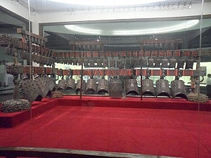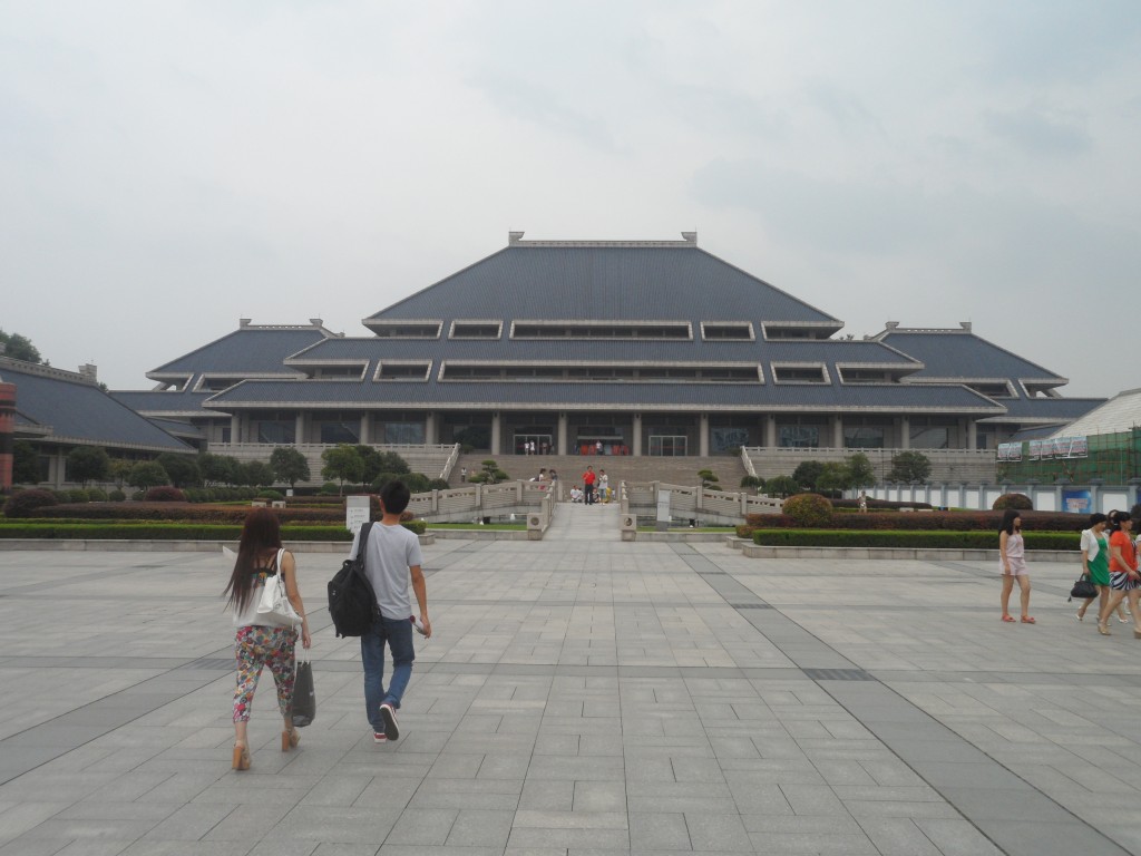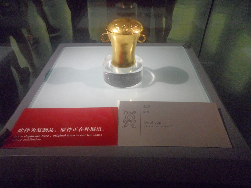 Gestärkt und ohne Schädelbruch machten wir uns anschließend auf den Weg zum Geschichtsmuseum, das wir zusammen besichtigen wollten. Einer der vielen Vorteile dieser Sehenswürdigkeit bestand darin, dass man für den Spaß nicht einmal zahlen musste. Bereits die Bauweise des Museums war durchaus sehenswert. Um zu den Ausstellungsstücken zu gelangen, überquerten wir einen weitläufigen Platz, dessen Mitte ein sehr akkurat angelegter Grünstreifen mit einem Springbrunnen zierte. Zum Hauptgebäude stiegen wir dann eine imposante Steintreppe hinauf und konnten uns dann auf ganzen vier Stockwerken austoben. Zuerst widmeten wir unsere Aufmerksamkeit den Resultaten von Ausgrabungen an der Grabstätte eines alten, mächtigen Herrschers, den man mit allerhand Grabbeigaben versehen hatte. Nachdem wir seinen beeindruckend ehebettgroßen Sarkophag bestaunt hatten, lernten wir, dass man auf der Reise ins Jenseits offenbar unbedingt mit haufenweise Wein, dutzenden Dreifußkesseln (die die Macht des Besitzers symbolisieren) und sogar bestenfalls mehreren Nachttöpfen ausgestattet sein sollte. Sehr fürsorglich, falls die Blase auf dem Weg dann doch mal anfängt, zu drücken. Wofür man dabei allerdings ein überdimensionales Glockenspiel mit über hundertfünfzig riesigen Bronzeglocken brauchen sollte, ist mir bis heute nicht ganz klar. Fürs Handgepäck waren die garantiert ein bisschen zu groß, aber vielleicht habe ich da ja auch etwas falsch verstanden, weil sich die englischen Beschreibungen auf den Lesetafeln teilweise eher als verwirrend erwiesen.