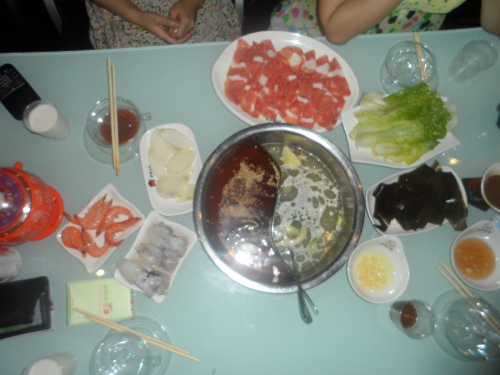 Mir hat jene Art, den Abend zu verbringen, jedenfalls sehr gut gefallen, doch trotzdem war ich froh, als wir uns dann nach einiger Zeit dem Dinieren zuwandten. Dafür nahmen wir einen bestimmten Aufzug in ein Stockwerk, das nur für einen ganz bestimmten Zweck ausgelegt war: Hot Pot essen. Und das schien eine sehr beliebte Beschäftigung unter den Besuchern des PPP zu sein, denn als sich die Aufzugtüren öffneten, erwartete uns bereits eine riesige Menschenansammlung, die darauf hoffte, bald einen heißbegehrten Platz ergattern zu können. Die Zeit, bis wir ebenfalls zum Zug kamen nutzte ich zuerst, um mich mit einem freundlichen Studentenpärchen bekanntzumachen, die beide bereits ein Jahr in den USA verbracht hatten. Ein bisschen beunruhigend wirkte zuerst auf mich, dass eine der ersten Fragen des Jungen lautete „Do you smoke weed?“. Es stellte sich jedoch heraus, dass er das nur wissen wollte, weil er mich zuerst für einen Holländer gehalten hatte und darüber hinaus in Amerika an der mexikanischen Grenze gelebt hatte, wo man angeblich problemlos an solche Schabutzkis rankommt.