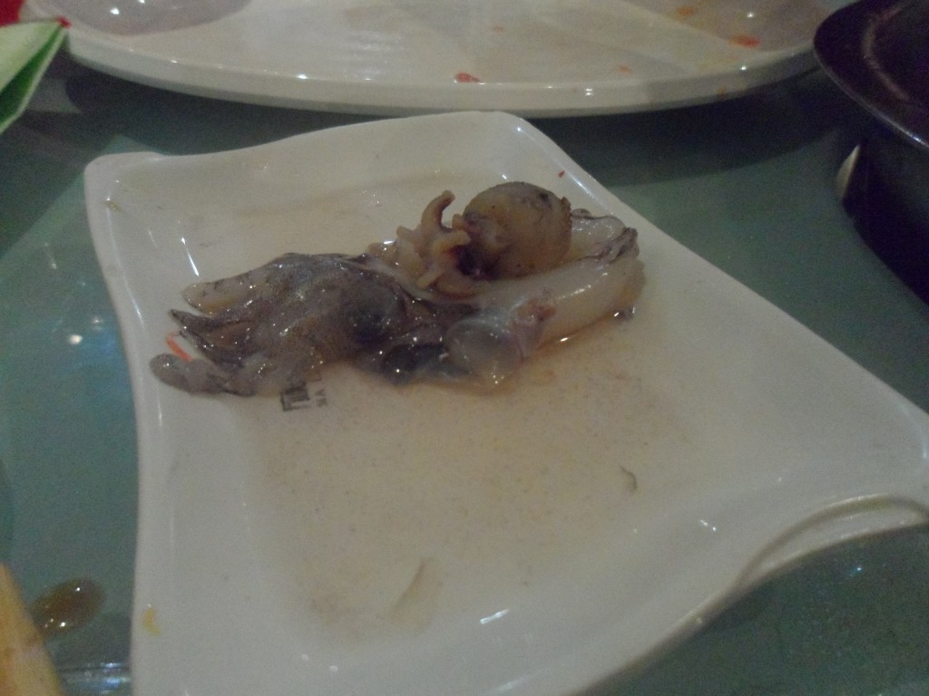 Vorerst freute ich mich aber auf den Hot Pot, der uns als Belohnung für eine halbe Stunde Warten endlich aufgetischt wurde. Für jene, die noch nicht wissen, was man sich genau darunter vorstellen soll, erkläre ich das Ganze kurz. Grundsätzlich versteht man unter einem Hot Pot eine zweigeteilte Schüssel mit zweierlei Arten heiß blubbernder Suppe, die die ständig erhitzt wird. Eine Hälfte schmeckt angenehm würzig, die andere einfach nur schweißtreibend scharf, aber sehr lecker. In diesen Topf wirft man nun allerlei rohes Gemüse, Fleisch, Pilze oder sonstige Zutaten, die man zuvor ausgewählt hat und fischt diese wieder heraus, sobald sie gar sind. Aus irgendeinem unerfindlichen Grund war wohl aus dem gestrigen Abendessen die Annahme hervorgegangen, ich esse nichts lieber als „You Yu“, also Tintenfisch. Deswegen hatte mir Jiao Jiao vorsorglich gleich sechs ganze Tintenfische bestellt, die mich nun aus ihren toten Kameraaugen anglotzten. Zuckersüß grinsend ließ ich sodann einen nach dem anderen wahllos in die Brühe fallen, in der Hoffnung, dass sie sich vielleicht auflösen würden. Falsch gedacht. Hilfsbereit, wie meine Freundinnen nun einmal sind, legten sie mir die Kopffüßer einfach in einem unaufmerksamen Moment auf den Teller. Das Gute an meinem Versuch, die Viecher loszuwerden, äh, zu kochen, bestand darin, dass sie danach auf ein Zehntel ihrer ursprünglichen Größe zusammengeschrumpft waren. Eigentlich sahen sie jetzt sogar ganz putzig aus, schmeckten allerdings trotzdem meiner Meinung wie scharf gewürzter Fahrradreifen. Letztlich schwammen dann aber Ende dieses schönen Tages tatsächlich alle sechs You Yus in meinem Magen und ich hoffe innig, dass sie sich dort nicht festgesaugt haben.