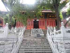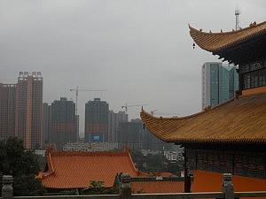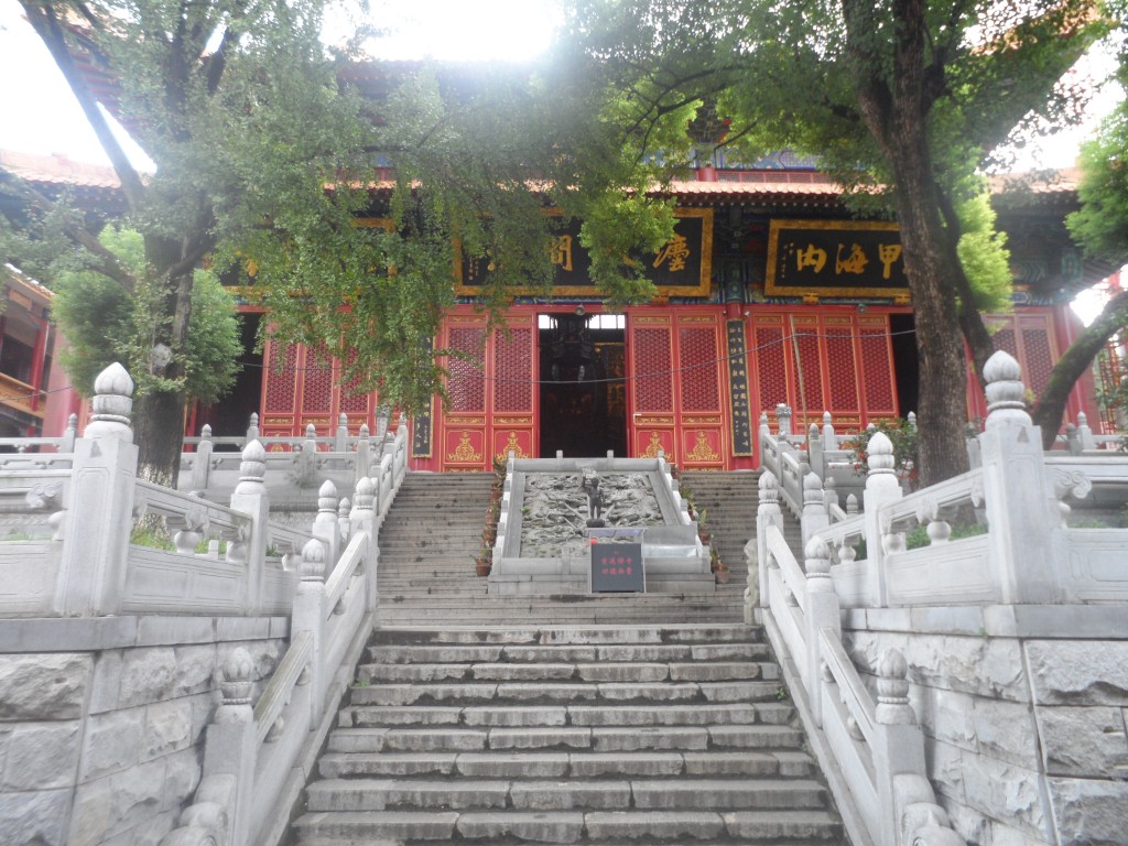 Um mir noch den letzten Kultur-Overkill zu geben, ging es am nächsten Tag munter weiter mit einer Besichtigung des daoistischen Tempel des Wuchang Districts. Dieses Mal aber machte ich mich mit meinen sehr geschätzten Wuhanner Mitfreiwilligen Flo, Simon und Philipp auf den Weg, wodurch wir fleißig Fotos schießend sicher ein gutes Touristen-Bild abgaben. An einen innerstädtischen Berg geschmiegt und vollkommen von modernen Hochhäusern eingerahmt, gab der Tempel wirklich ein beeindruckendes Bild ab. Über steinerne Treppenstufen stiegen wir von einem Haus zum nächsten, den Finger natürlich immer in der Nähe des Abzugs. Das Detailreichtum, das sich uns dort bot, ist in Worten kaum zu beschreiben. In den knalligsten Farben präsentierten sich uns aufwändige Holzverzierungen an Wänden und Giebeln, zahllose hünenhafte und recht unzufrieden dreinblickende Götterstatuen und fein gearbeitete Wandbehänge. In einer Halle fand gerade sogar eine Art Gottesdienst statt (ich bin mir nicht sicher, ob man das so nennen kann). In einer ewig langen Prozession schritten die umhangtragenden Frauen und Männer würdevoll durch den Raum. Dabei gab die vorderste Dame durch ein Mikro einen sich ständig wiederholden Singsang vor, den die anderen sich stetig vor und zurückwiegend nachsangen. Ganz im Takt übrigens mit dem Hämmern der Bauarbeiter, die direkt nebenan fleißig ein Gebäude einrissen. Ein wunderbares Sinnbild dafür, wie nahe sich in China Tradition und Fortschritt stehen. Ebenfalls lustig anzusehen waren die Säulen eines kleinen Unterstands, die mit schreiend knalligen Werbeplakaten für irgendein Softgetränk beklebt waren. Naja, aber warum sollte sich ein Mönch auch nicht von Zeit zu Zeit eine Cola genehmigen?