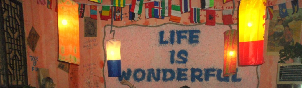 Als ich von der kalten, unbelebten Straße ins warme, orangefarbene Schummerlicht des Feelings trete, schlägt mir bereits der gewohnte Duftcocktail aus Bratfett, Popcorn, Bier und ein bisschen Zitrone entgegen. Die übliche bunt zusammengewürfelte Playlist, die der Sage nach irgendwann einmal ein ausländischer Student hinterlassen hat, läuft garantiert bereits zum dritten Mal und die heimeligen Holzbänke sind schon ordentlich mit unbekannten Gesichtern besetzt. Ich laufe vorbei an knallbunten Lampions und aufgehängten Länderflaggen, bis ich am Tresen freudig vom Barbesitzer Zhang Ping, dem Barkeeper Tao und der Bedienung Cherry begrüßt werde. Im hintersten Eck des relativ überschaubaren Raums hat man vorsorglich zwei Bänke zusammengeschoben und die drei WG-Bewohner, die Holländerin Astrid, Aileen aus Costa Rica, die Urheberin der SMS Nadine, Elly aus Bayern und der Amerikaner Dash studieren bereits eifrig die Cocktailkarte. Über ihnen prangt an der ohnehin über und über vollgekritzelten Wand in großen blauen Lettern der Schriftzug „LIFE IS WONDERFUL“.
