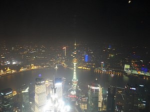 Trotz dass die vergangenen Tage geprägt gewesen waren von zahlreichen schönen Ausblicken, fand unsere Panoramajagd auf dem Skywalk des Flaschenöffners im wahrsten Sinne des Wortes ihren Höhepunkt. Als wir uns die Nase an den Scheiben plattdrückten, konnten wir gewissermaßen auf die Dächer aller anderen Wolkenkratzer in der Umgebung herab spucken, die bereits ihre übliche Leuchtorgel für uns angeworfen hatten. Hinter den Kugeln des Oriental Pearl Towers schlängelte sich der Fluss wie ein schwarzes Band durch die nächtliche Stadt und die Straßenschluchten vereinten sich zu einem Netzwerk aus rotgelb glühenden Lichtfäden, das bis zum Horizont reichte. Das schrie förmlich nach einem Gruppenfoto! Also schrieen wir wiederum einmal recht freundlich „Whisky!!!“ in die Kamera von einem chinesischen Fotografenpärchen und gingen gespannt zwei Stöcke tiefer, um die Resultate zu begutachten.