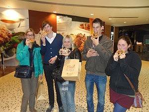 Ich denke, nun ist auch der richtige Zeitpunkt gekommen, um zu enthüllen, dass sich (wer hätt’s gedacht) hinter dem Codewort „Hamster“ natürlich kein echter Nager versteckte. Stattdessen fand unser Geburtstagskind in dem Karton eine Geburtstagstorte, die wir in der deutschen Bäckerei ganz individuell hatten anfertigen lassen. Gegen entsprechende Bezahlung durfte ich ein Motiv vorzeichnen, das der Chefkonditor mit Schokoglasur nachgemalt hatte. Das Ergebnis dessen war zugegebenermaßen ähnlich verformt wie unser Gruppenfoto auf dem Flaschenöffner und darüber hinaus hatte man es besonders gut gemeint und einfach all unsere Schriftentwürfe mit auf die Torte gepackt. So stand da zwar nun aus unerfindlichen Gründen „aales Gute – Alles Gute – Happy Birthday“, aber immerhin mundete der Hamster ganz vorzüglich.