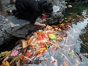 Weil wir in dieser Nacht einfach so viel, äh, Torte gegessen hatten, gingen wir den nächsten Tag lieber etwas ruhiger an mit einem entspannten Spaziergang am Bund entlang. Dafür waren wir an unserem letzten Tag in Shanghai wieder bereit für einen finalen Sightseeing-Trip zum Tempel des weißen Jade-Buddhas. Inmitten von Hochhäusern glaubten wir hier, ein Stück chinesischer Tradition zu finden, doch als einer der wenigen historischen Attraktionen der Stadt erschien mir das Ganze doch ein wenig übertrieben kommerzialisiert. Dass man in chinesischen Tempeln gerne ein paar Münzen springen lässt, bin ich mittlerweile gewohnt und meistens macht mir das Ganze auch noch recht viel Spaß. Aber falls man nicht gerade zum ersten Mal einen solchen Tempel besucht oder unbedingt irgendwelche sündhaft teuren Talismane kaufen möchte, hat die Anlage nicht allzu viel zu bieten. Mal abgesehen einem Teich voller handzahmer Koikarpfen und dem weißen Jade-Buddha, der so unschätzbar wertvoll ist, dass man für ihn noch einmal zusätzlich Eintritt zahlen darf.