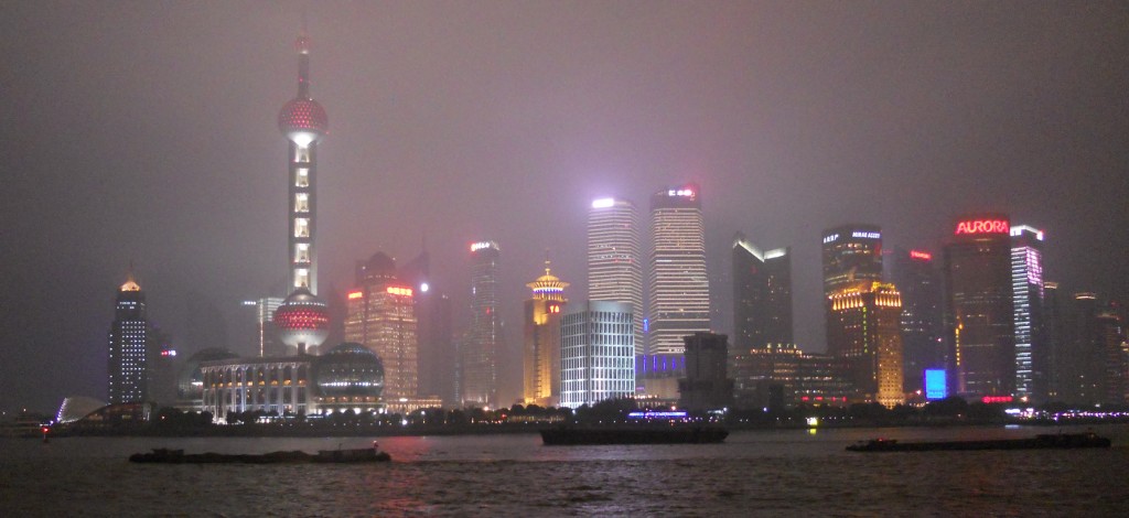 Als wir uns ausführlichst Punkt 7 gewidmet hatten, fühlten wir uns zwar vollgestopft wie Frühlingsrollen, doch bereit, den Abend in Angriff zu nehmen. Dann nichts wie auf zum Bund für ein paar Erinnerungsfotos! Die Uferpromenade des Huangpu-Flusses ist eine der berühmtesten Touristenattraktionen der Stadt und das Titelbild von jeder zweiten Shanghai-Postkarte. Am Kopfende der Nanjing Lu, einer der größten Einkaufsstraßen Chinas, erhielt man einen wunderbaren Blick auf die Sonderwirtschaftszone Pudong an der gegenüberliegenden Seite des Flusses. Von hier aus konnten wir unseren Blick über einen Wall von hochmodernen, in allen Farben leuchtenden Wolkenkratzern schweifen lassen. Markenzeichen des Panoramas und Wahrzeichen von Shanghai: der Oriental Pearl Tower, ein Fernsehturm, der allerdings eher aussieht wie eine 468 Meter gigantische Rakete. Begeistert versuchte jeder, die beste Aufnahme von diesem blinkenden, futuristisch anmutenden Szenario zu schießen, bevor es dann mit dem schönsten Teil der Abendplanung weiterging.