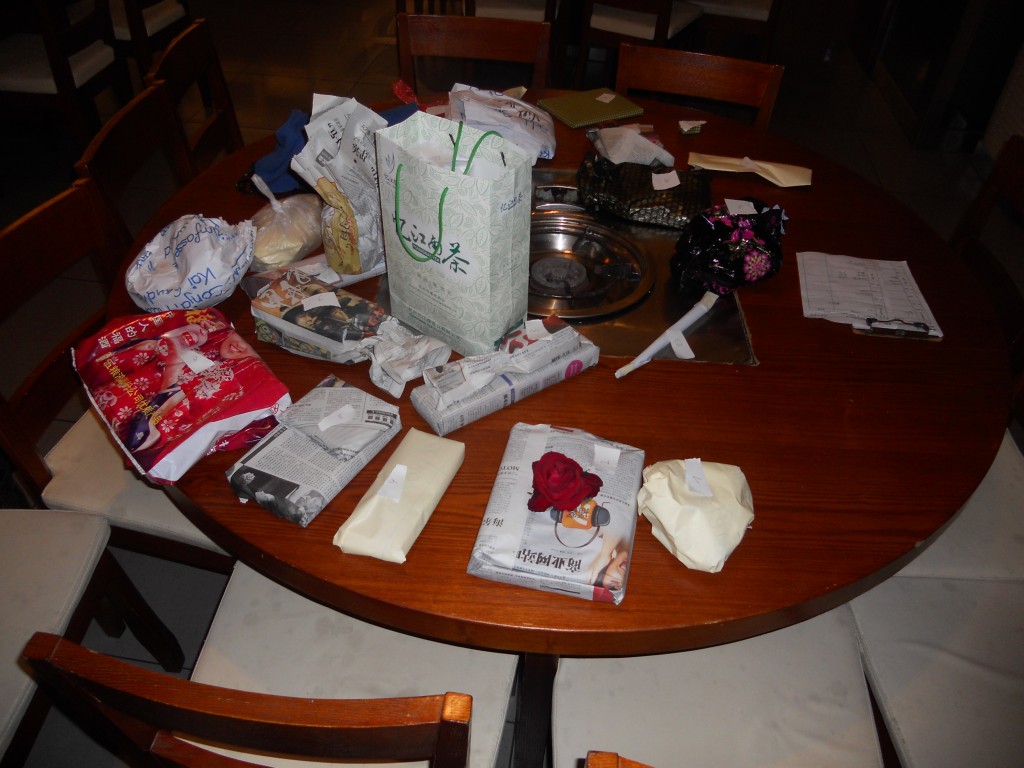 Unsere kreativen Auswüchse wurden am Abend, dem bereits letzten Abend unseres Seminars, belohnt, indem wir alle lecker HotPot essen gingen und danach endlich zur Wichtel-Bescherung schritten. Auf einem Tisch stapelten sich kleine Päckchen in teilweise wirklich interessanten Formen – und ihr Inhalt stellte sich zum Teil als noch interessanter heraus. Während ein paar so nützliche Dinge wie Fächer, Essstäbchen, Büchern oder ein gutes Zentrumsbier auspackten, mussten sich andere mit eingeschweißten Hühnerfüßen, tausendjährigen Eiern und BaiJiu anfreunden. Ich selbst freute mich über einen Propeller im Doraemon-Stil (Doraemon ist eine katzenähnliche Animefigur aus Japan und in China genauso berühmt wie Totoro). Simon freute sich darüber allerdings weniger, als ich ihm damit fast die Nase absäbelte. Wie dem auch sei, mein eigenes Wichtelgeschenk, eine Teeflasche mit einer Packung SanJiu, fand übrigens zufällig genau die richtige Besitzerin, nämlich Fanny. Die Gute konnte mir ja jetzt bald nicht mehr jeden Tag meine ständige Begleiterin abluchsen und hatte so einen dauerhaften Ersatz dafür gefunden. Schön, wie sich die Dinge manchmal einfach fügen!