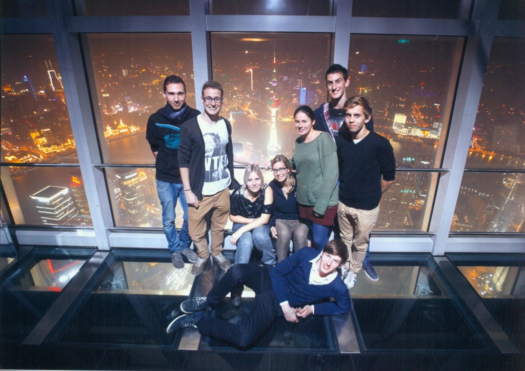 Trotz dass die vergangenen Tage geprägt gewesen waren von zahlreichen schönen Ausblicken, fand unsere Panoramajagd auf dem Skywalk des Flaschenöffners im wahrsten Sinne des Wortes ihren Höhepunkt. Als wir uns die Nase an den Scheiben plattdrückten, konnten wir gewissermaßen auf die Dächer aller anderen Wolkenkratzer in der Umgebung herab spucken, die bereits ihre übliche Leuchtorgel für uns angeworfen hatten. Hinter den Kugeln des Oriental Pearl Towers schlängelte sich der Fluss wie ein schwarzes Band durch die nächtliche Stadt und die Straßenschluchten vereinten sich zu einem Netzwerk aus rotgelb glühenden Lichtfäden, das bis zum Horizont reichte. Das schrie förmlich nach einem Gruppenfoto! Also schrieen wir wiederum einmal recht freundlich „Whisky!!!“ in die Kamera von einem chinesischen Fotografenpärchen und gingen gespannt zwei Stöcke tiefer, um die Resultate zu begutachten.