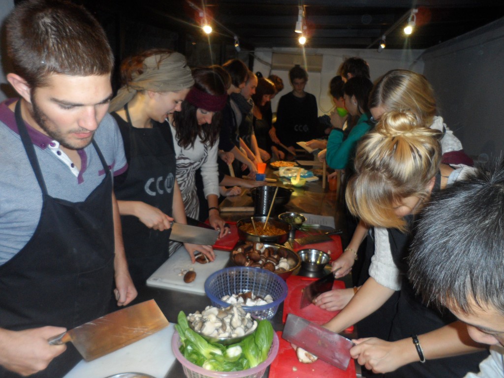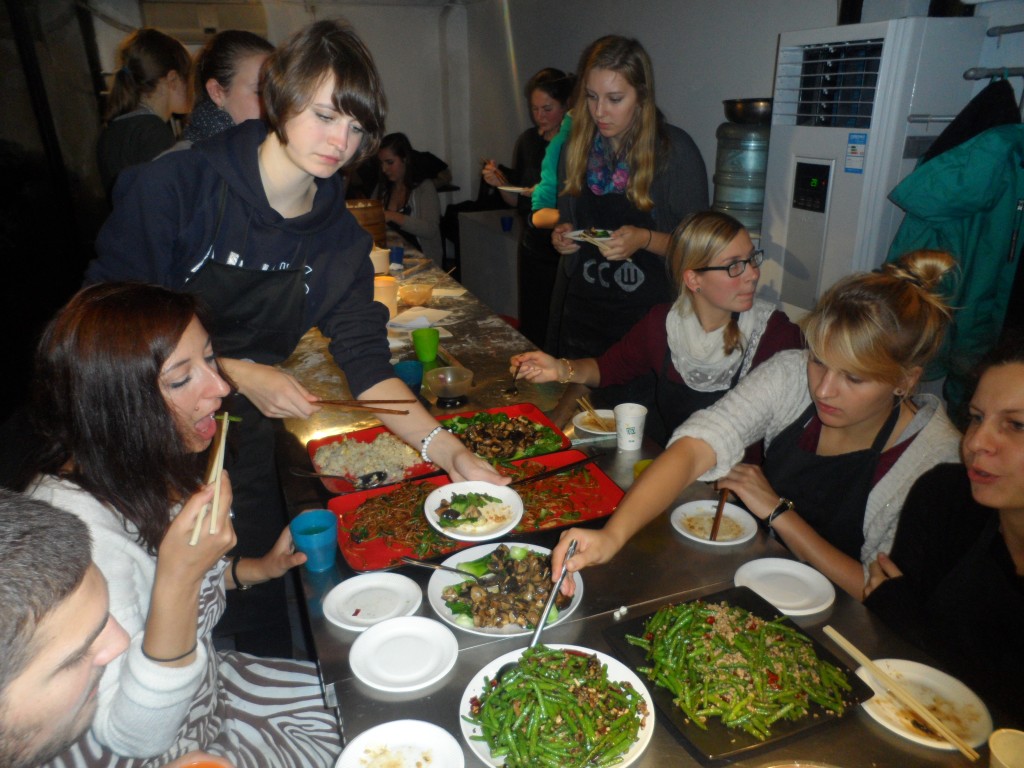 Was auch immer das mit dem auf das Milgram-Experiment beruhenden Kunstwerk zu tun hatte, auf den Tag traf diese Aussage jedenfalls zu. Anschließend trafen wir uns nämlich alle zusammen zum Kochkurs in der French Concession, einem der teuersten Viertel Shanghais. Dazu rüsteten wir uns mit ungemein modischen Schürzen aus und versammelten uns um eine lange Tafel, auf der sich betörend die verschiedensten frischen Zutaten türmten. Nachdem sich unsere beiden Laobans (das heißt so viel wie Chefs) vorgestellt hatten, teilten wir uns in zwei Gruppen auf. Die einen versuchten sich an den berühmten gefüllten Dumplings, die andere Hälfte stürzte sich in Zweierteams auf einige chinesische Gerichte, die auf keiner Speisekarte fehlen dürfen. Hier eine äußerst hilfreiche Schritt-für-Schritt-Anleitung zum Kochen eines recht leckeren Bohnen-Hackfleisch-Schabutzkis, für das Flo und ich zuständig waren: