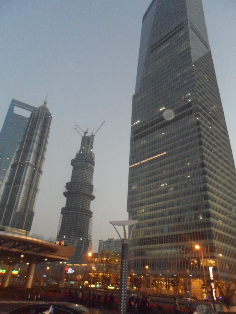 Dort gelang es Shanghai wieder einmal, uns sprichwörtlich kleinzukriegen. Egal, in welche Richtung man den Hals reckte, überall streckten sich Wolkenkratzer in den Abendhimmel. Eine Science-Fiction-Rakete, riesige griechische Säulenbauten, ein Dach in Form einer geöffneten Lotusblüte, chinesische Tempelarchitektur gemischt mit moderner Glasfassaden-Bauweise. Man schien den Architekten wirklich jegliche künstlerische Freiheit zugesprochen zu haben – solange es nur möglichst umwerfend und prestigeträchtig aussah! Selbstverständlich kamen wir nicht umhin, auf eines dieser Prestigeprojekte zu steigen. Wenn schon, denn schon, lautete die Devise und so wählten wir dafür das Word Financial Center, das vierthöchste Gebäude der Welt und das höchste, das es in China zu finden gibt. Zumindest bis der Nachbarturm fertiggestellt ist, der China endlich wieder den Rang als Nation mit dem höchsten Wolkenkratzer einbringen soll.