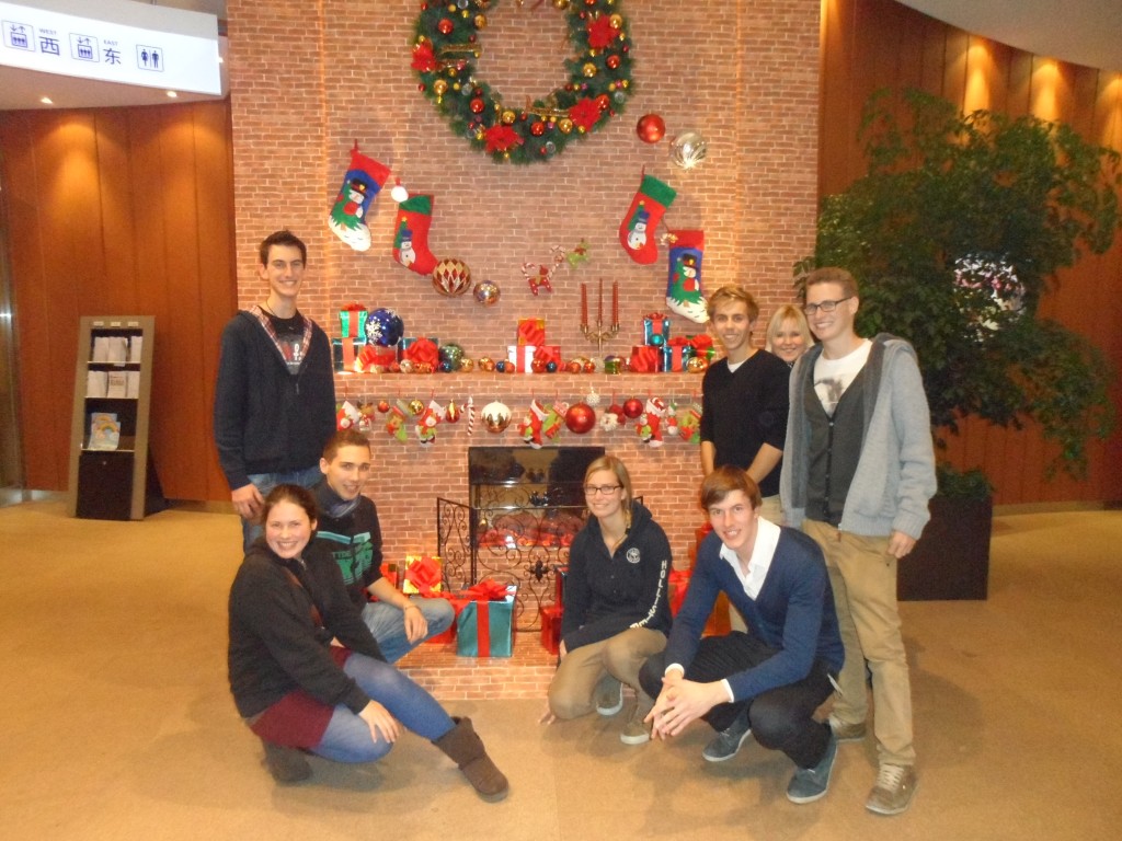 Auf noch mehr Heimatgefühl stießen wir danach, als wir vor dem Ausgang einen sehr authentischen Kamin entdeckten, der mit weihnachtlicher Dekoration und Geschenk-Packungen geschmückt war. Nachdem uns der Sicherheitsmann freundlich darauf hingewiesen hatte, dass wir davon gefälligst die Finger lassen sollten, versammelten wir uns eben ohne Christbaumkugeln in der Hand zum nächsten Gruppenfoto: „ Freiwillige auf der Suche nach ein bisschen Weihnachtsstimmung in China“.