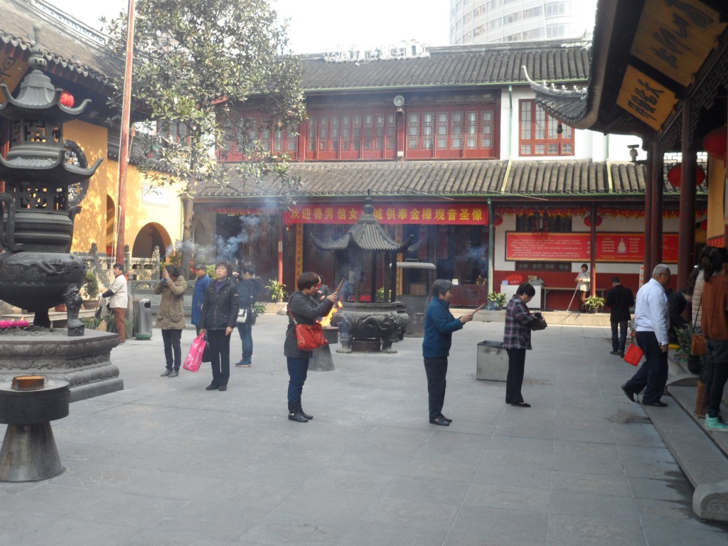 Weil wir in dieser Nacht einfach so viel, äh, Torte gegessen hatten, gingen wir den nächsten Tag lieber etwas ruhiger an mit einem entspannten Spaziergang am Bund entlang. Dafür waren wir an unserem letzten Tag in Shanghai wieder bereit für einen finalen Sightseeing-Trip zum Tempel des weißen Jade-Buddhas. Inmitten von Hochhäusern glaubten wir hier, ein Stück chinesischer Tradition zu finden, doch als einer der wenigen historischen Attraktionen der Stadt erschien mir das Ganze doch ein wenig übertrieben kommerzialisiert. Dass man in chinesischen Tempeln gerne ein paar Münzen springen lässt, bin ich mittlerweile gewohnt und meistens macht mir das Ganze auch noch recht viel Spaß. Aber falls man nicht gerade zum ersten Mal einen solchen Tempel besucht oder unbedingt irgendwelche sündhaft teuren Talismane kaufen möchte, hat die Anlage nicht allzu viel zu bieten. Mal abgesehen einem Teich voller handzahmer Koikarpfen und dem weißen Jade-Buddha, der so unschätzbar wertvoll ist, dass man für ihn noch einmal zusätzlich Eintritt zahlen darf.