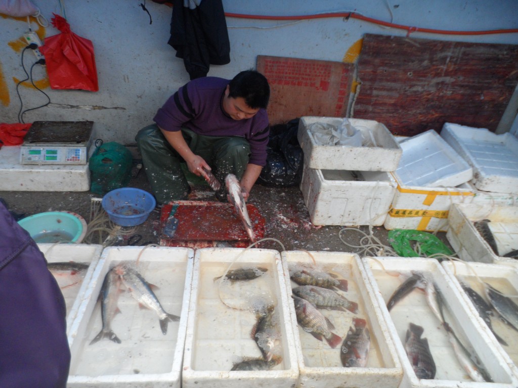 Eine viel authentischere Entdeckung machten wir allerdings in einer engen Seitenstraße in der Nähe des Tempels. Dort boten auf dem Fischmarkt zahlreiche Verkäufer dicht aufeinander gedrängt ihre frische Ware feil. Unter frisch darf man sich aber keinesfalls ein paar auf Eis gelegte Fleischstücke vorstellen. Im Gegenteil, in China gilt die Faustregel „Alles, was zumindest beim Anfassen noch zappelt, ist frisch“. In der Praxis hieß das, dass man hier an dutzenden kleinen Becken vorrüberging, in denen sich Aale, Barsche, Karpfen, Ochsenfrösche und Krabben tummelten. Wer das gerne einmal in Bewegung sehen will, kann das gerne im neuesten Feature meines Blogs, der Sektion für stümperhaft mit der Handkamera gedrehte Videos, tun.
