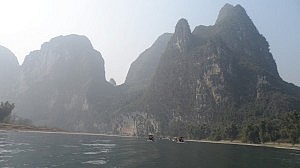 Früh am Morgen unseres dritten Tages stiegen wir in einen Touri-Bus, der uns nach Yangshuo bringen sollte. Unser Reiseführer stellte sich mit dem einprägsamen Namen „KFC“ vor, mit der schlagfertigen Begründung, das seine Lieblings-Fastfood-Kette überall den gleichen Qualitäts-Standard bietet. Das konnte ja nur gut werden. Wir düsten nämlich nicht nur geradewegs zum nächsten Bestimmungsort, sondern hielten auf halben Weg in einem Dorf am Li-Fluss an, der von Guilin nach Yangshuo fließt. Hier stiegen wir an jeweils zu viert auf ein Boot, das aus ein paar langen, hohlen Plastikrohren und einem kleinen Sonnenschutz zusammengebaut war. Nachdem wir vom Ufer abgelegt hatten, bot sich uns zum ersten Mal die Gelegenheit, die überwältigende Landschaft der Region Guangxi zu bewundern.