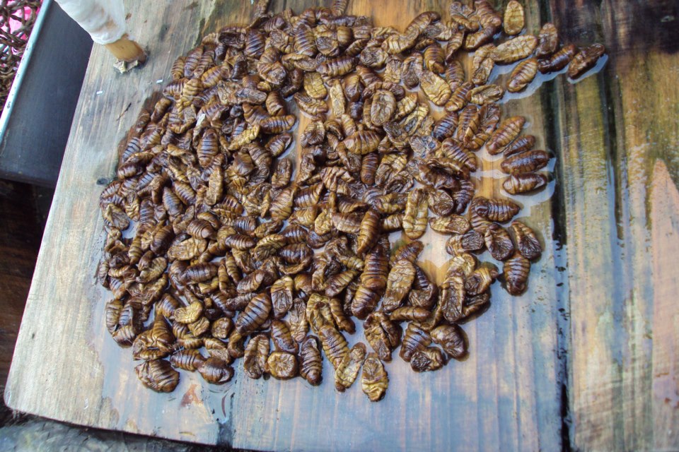 Bevor wir unsere Reise fortsetzen, erfuhr ich noch vom ähnlich unglücklichen Schicksal einer ganz anderen Tierart. In einer der hübsch angelegten Snack-Streets der Stadt sahen wir dabei zu, wie eine Frau vor einem Laden Seide herstellte. Dazu muss man die Seidenraupen-Kokons erst einmal auskochen, sodass sich das sterbende Insekt von seinen Spinnfäden löst. Anschließend trennt man den feinen Stoff und die toten Körper voneinander. Und einen dieser bräunlichen, glitschigen Leichname hielt mir die Seidenspinnerin auf einmal vor meine neugierige Nase. Was sollte ich den jetzt damit? Grinsend nahm die nette Dame eine der Raupen und biss einmal herzhaft hinein. Wäre ja auch wenig nachhaltig gewesen, die armen Tierchen einfach wegzuwerfen. Um zu verhindern, dass die Gute mich am Ende noch eine davon höchstpersönlich in den Mund steckte, nahm ich also dankend ein paar davon entgegen und legte sie mir auf die Zunge. Recht mehlig, das Ganze, mit einem an Shrimps erinnernden Chitin-Panzer leicht nussig im Abgang. Naja, aber wie uns Timon und Pumbaa so schön lehrten: Schleimig, aber vitaminreich! Und immerhin kostenlos!