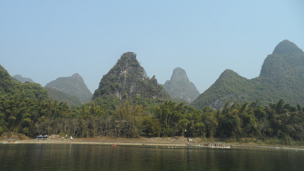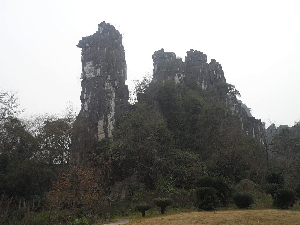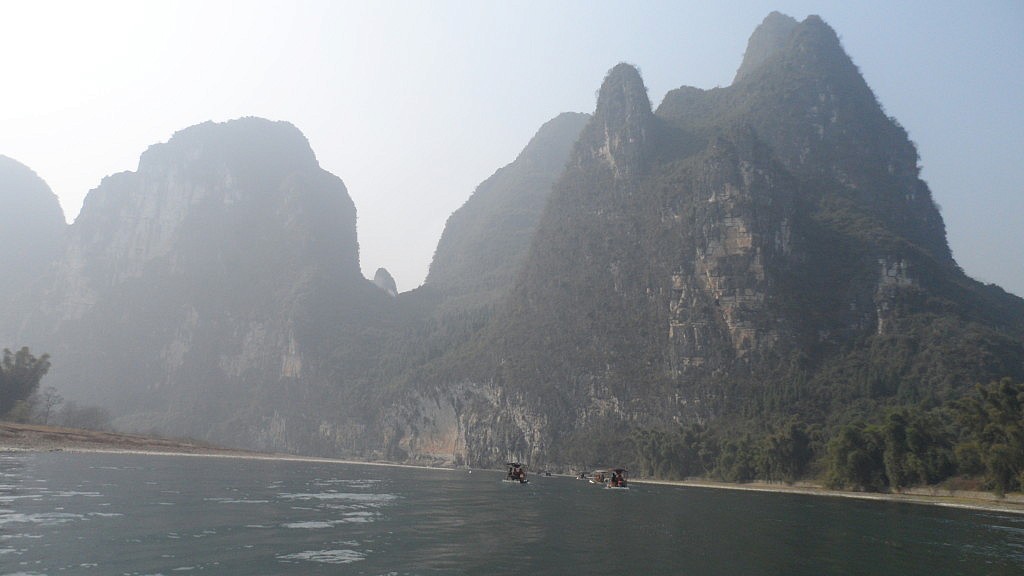 So kamen wir am nächsten Morgen entspannt in der Stadt an, die übersetzt so viel wie „Duftblütenwald“ bedeutet. Von Duftblüten sahen wir allerdings bei unserer Ankunft nicht sonderlich viel, denn die namensgebenden Osmanthus-Bäume, die hier überall wuchsen, trieben gerade erst ihre Knospen aus. Wenn man aber erst einmal am Bahnhof die Schwärme von nervtötenden, semiprofessionellen Reiseanbietern abgewimmelt hat, bietet die Stadt durchaus selbst ohne Duftblüten ein einigermaßen beeindruckendes Bild. Vor Urzeiten war das gesamte Areal nämlich von einem Ozean überflutet, aus dessen abgelagerten Sedimenten durch Abtragung heutzutage beeindruckende Karstberge gewachsen sind. Diese meist sehr steil abfallenden, bewachsenen Gesteinsformationen prägen das Bild der Stadt Guilin, da sie sich wie gigantische Wächter an einigen Stellen mitten aus dem Häusermeer erheben und der Siedlungsgebiet ein recht grünes Gesamtbild verleihen.