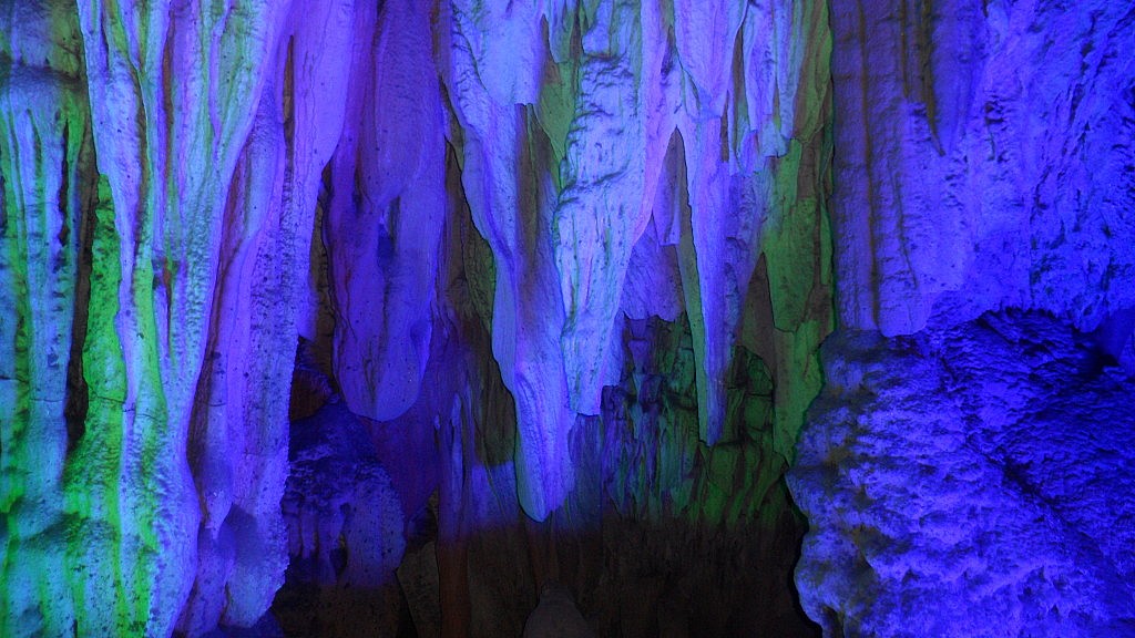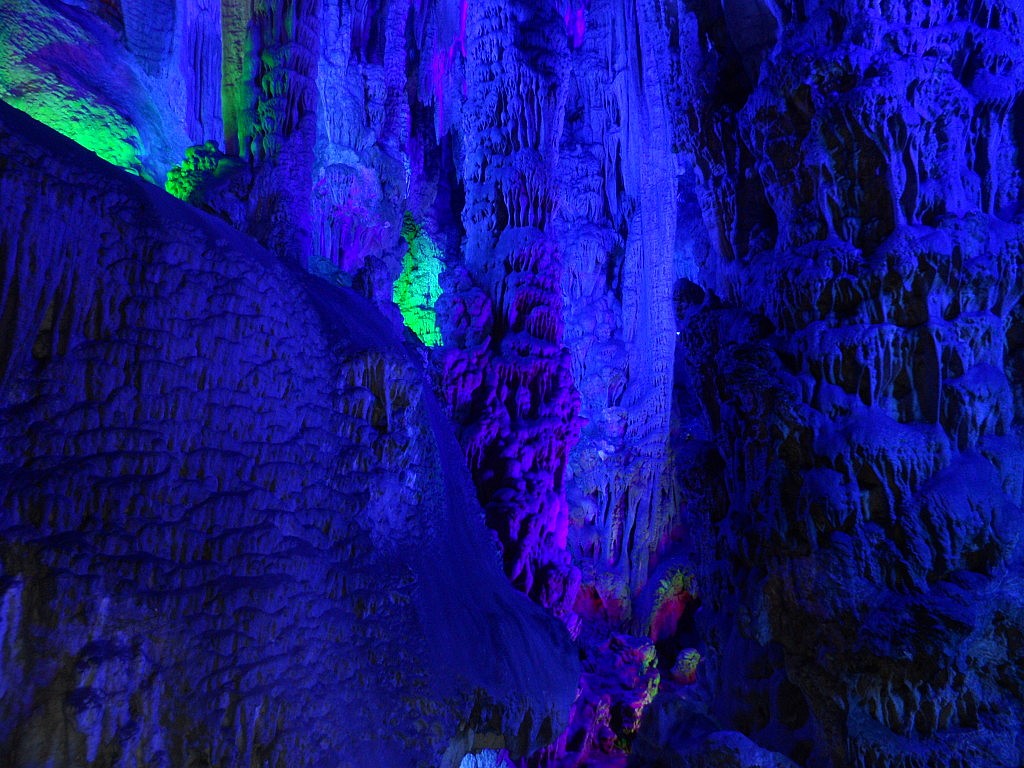 Auch der darauf folgende Ausflug führte uns in eine Höhle, die „Reed Flute Cave“, in der wir zum „Spelunking“ abtauchen wollten. Diese hübsche Vokabel hat mir David beigebracht und bezeichnet – wer hätte es gedacht – das Erkunden von unterirdischen Gängen und Höhlen. Wirklich gerecht wurden wir dieser Definition allerdings nicht, denn letzen Endes trabten wir die ganze Zeit im Stechschritt einer chinesischen Touristenführerin hinterher, die zu jedem Steinhäufchen einiges zu erzählen wusste. Überwältigend war das Ganze aber trotzdem. Es wäre ja auch zu langweilig, einfach mit der Taschenlampe die verschiedenen interessanten Gebilde anzuleuchten. Stattdessen hatte man überall geschickt LED-Bänder und Strahler installiert, die die Stalagmiten und Stalagtiten in allen Farben ausleuchteten. So fühlte man sich ein bisschen, wie als würde man durch Alice’s Wunderland wandern, während im Sekundentakt die Blitze von Fotoapparaten im Dunkel aufzucken.