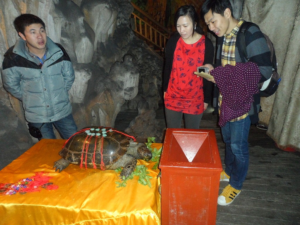 Zu guter Letzt entdeckten wir die unfreiwilligen Bewohner des Höhlenkomplexes. In einem etwas abgetrennten Bereich befanden sich ein paar kleine Steinbecken, in denen Schnappschildkröten und sogar einer majestätischen Karett-Schildröte missgelaunt hin- und herschwammen. Die hatte es allerdings immer noch besser getroffen als zwei ihrer Verwandten, welche sich als lebendiger Verkaufstisch keinen Zentimeter rühren durften und gefälschte Jade-Anhänger auf ihrem Panzer trugen. Was sich wohl die schlauen Köpfe gedacht hatten, die die touristische Erschließung der Reed Flute Cave geplant hatten? Wohl frei nach dem Motto: „Faszinierende Tropfsteine sind definitiv zu öde, lasst uns Schildkröten ins ewige Dunkel werfen, damit sich da unten wenigstens irgendwas bewegt “. Aus Mitleid für die armen Kreaturen sah ich jedenfalls trotz wärmster Erinnerung an die goldene Woche in Wuhan davon ab, ihre Schädel mit Münzen einzuschlagen (ich hätte sie ja gerne gerettet, Marie, aber leider haben die Armen nicht ganz ins Handgepäck gepasst!).